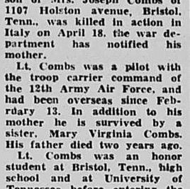 Lt. Combs entered the service April 5, 1943. He received his pilot’s wings and commisison June 17, 1944 at Blythewille, Ark. He was assigned to the 12th Air Force Troop Carrier Command in Rosignano, Italy. On April 18, 1945, while making a flight from his base in Forli, Italy during a storm, his plane crashed into the side of a mountain. Lt. Combs is a graduate of Tennessee High School and had almost finished two years at the University of Tennessee when he was called into active duty from the Air Corps Reserves. While at the university he was an honor student and a member of Pi Kappa Alpha fraternity.