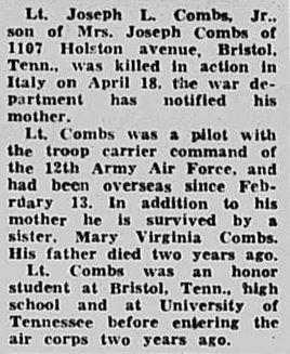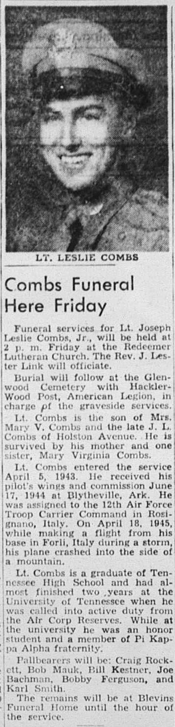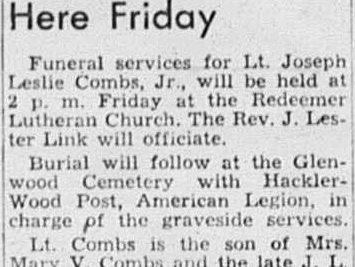 Funeral services for Lt. Joseph Leslie Combs, Jr., will be held at 2 p.m. at the Redeemer Lutheran Church. Burial will follow at the Glenwood Cemetery with Hackler-Wood Post, American Legion, in charge of the graveside services. Lt. Combs is the son of Mrs. Mary V. Combs and the late J.L. Combs of Holston Avenue. He is survived by his mother and one sister, Mary Virginia Combs.