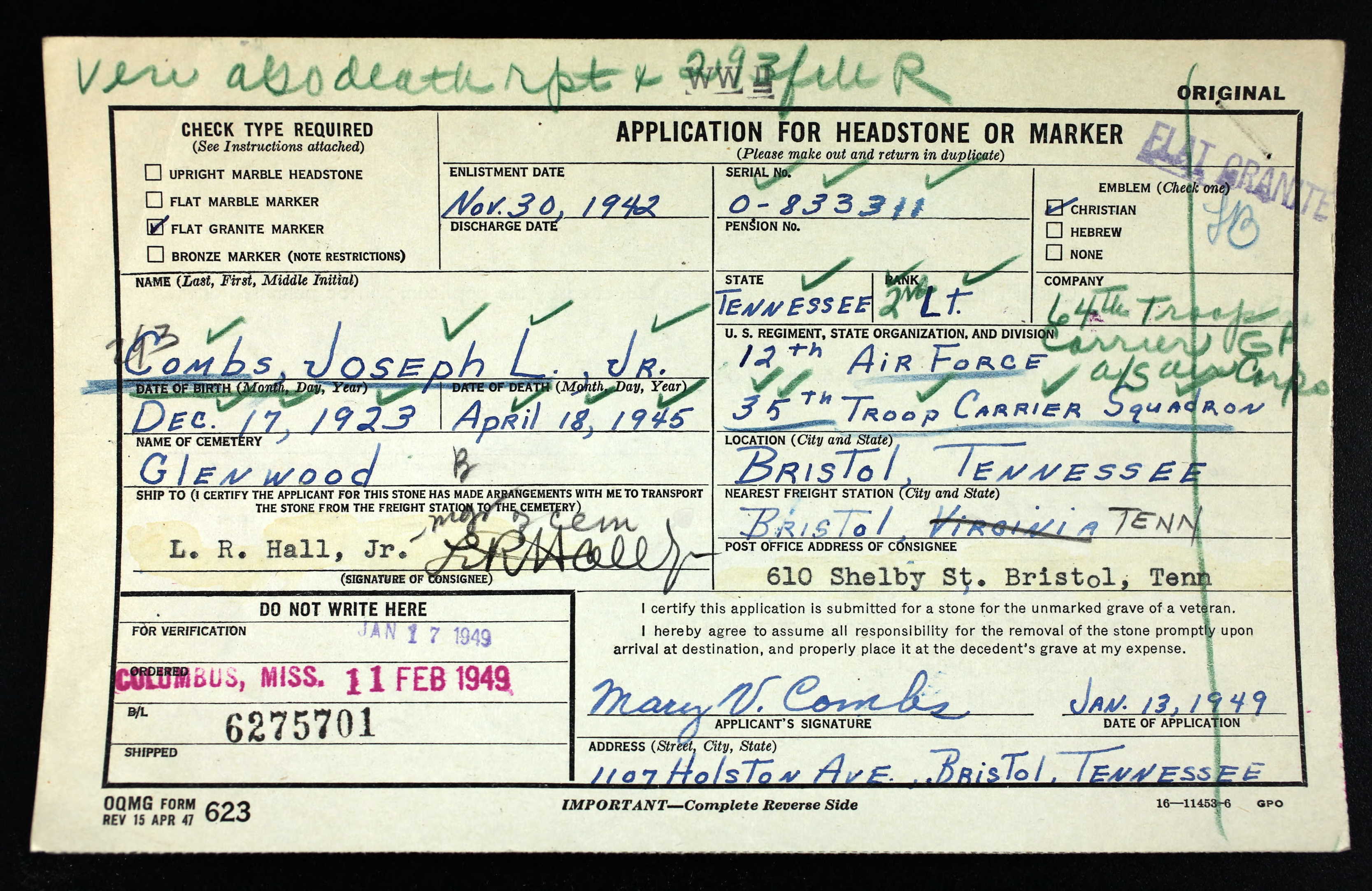 2nd Lieutenant Joseph “Joe” Leslie Combs died non battle in Italy on the 18th of April 1945.