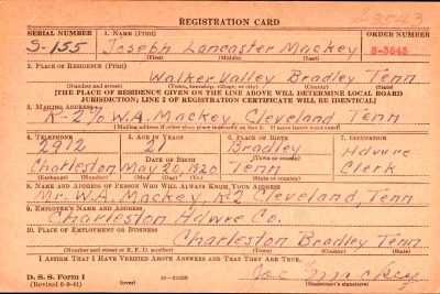 Cpl. Mackey had been in the U.S. Army three years, 18 months of which were overseas. He was a graduate of Charleston High School and was employed at the Wheland Manufacturing Company in Chattanooga at the time he enlisted in the army. He saw service in Africa, China and Burma and had been awarded a medal for bravery during the invasion of Burma. He was a member of the Charleston Methodist Church. He is survived by his parents; two brothers, Pfc. James Walter Mackey, Moody Field, Ga.; Theodore Mackey, Charleston; two sisters, Barbara, of Washington D.C., and Christine of Charleston. He was a grandson of Mrs. J.L. Mackey and the late Dr. Mackey of Charleston and Mr. and Mrs. J.H. Epperson, here. He was a nephew of Mrs. Walter Kyle of Cleveland.