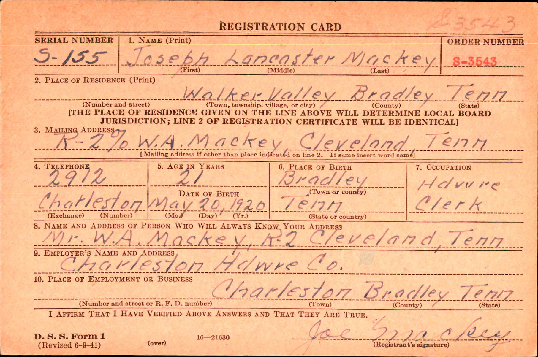 Joseph Lancaster “Joe” Mackey was born on 20 May 1920, the son of William Afton Maceky and Estelle Mae Epperson.