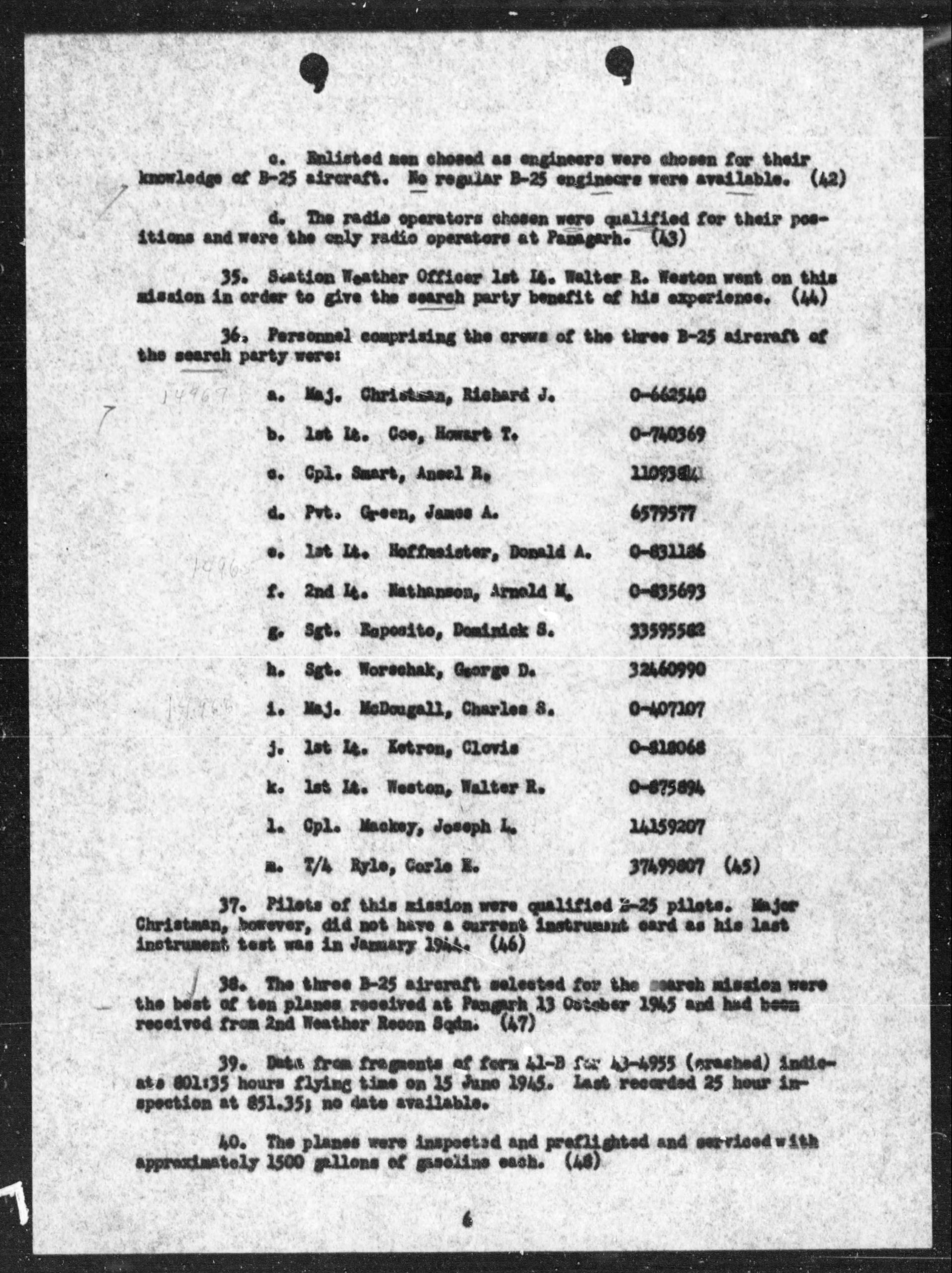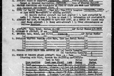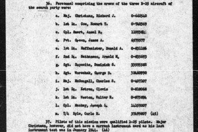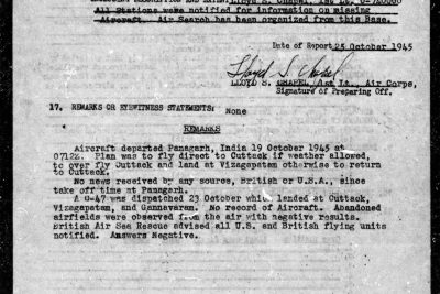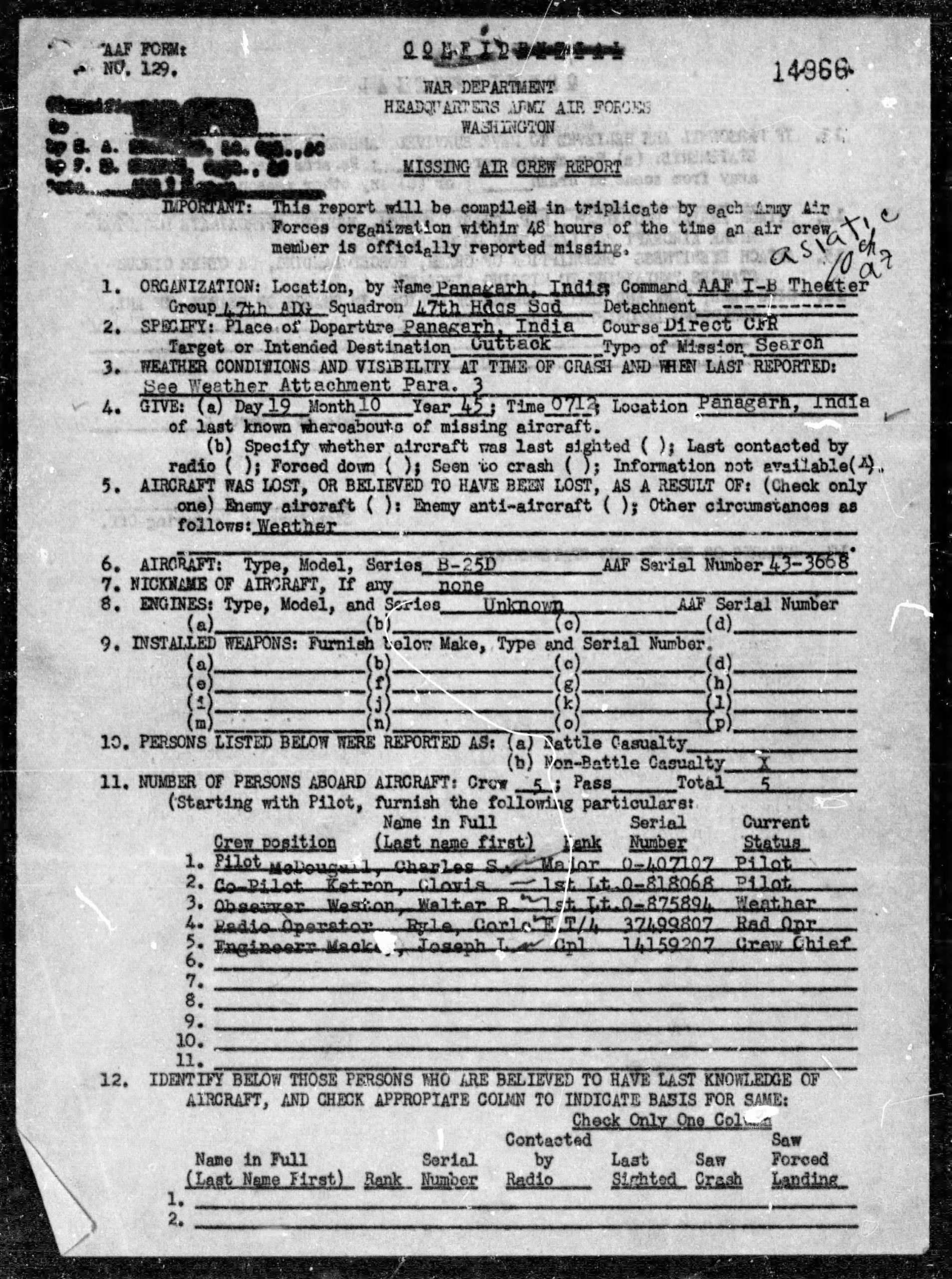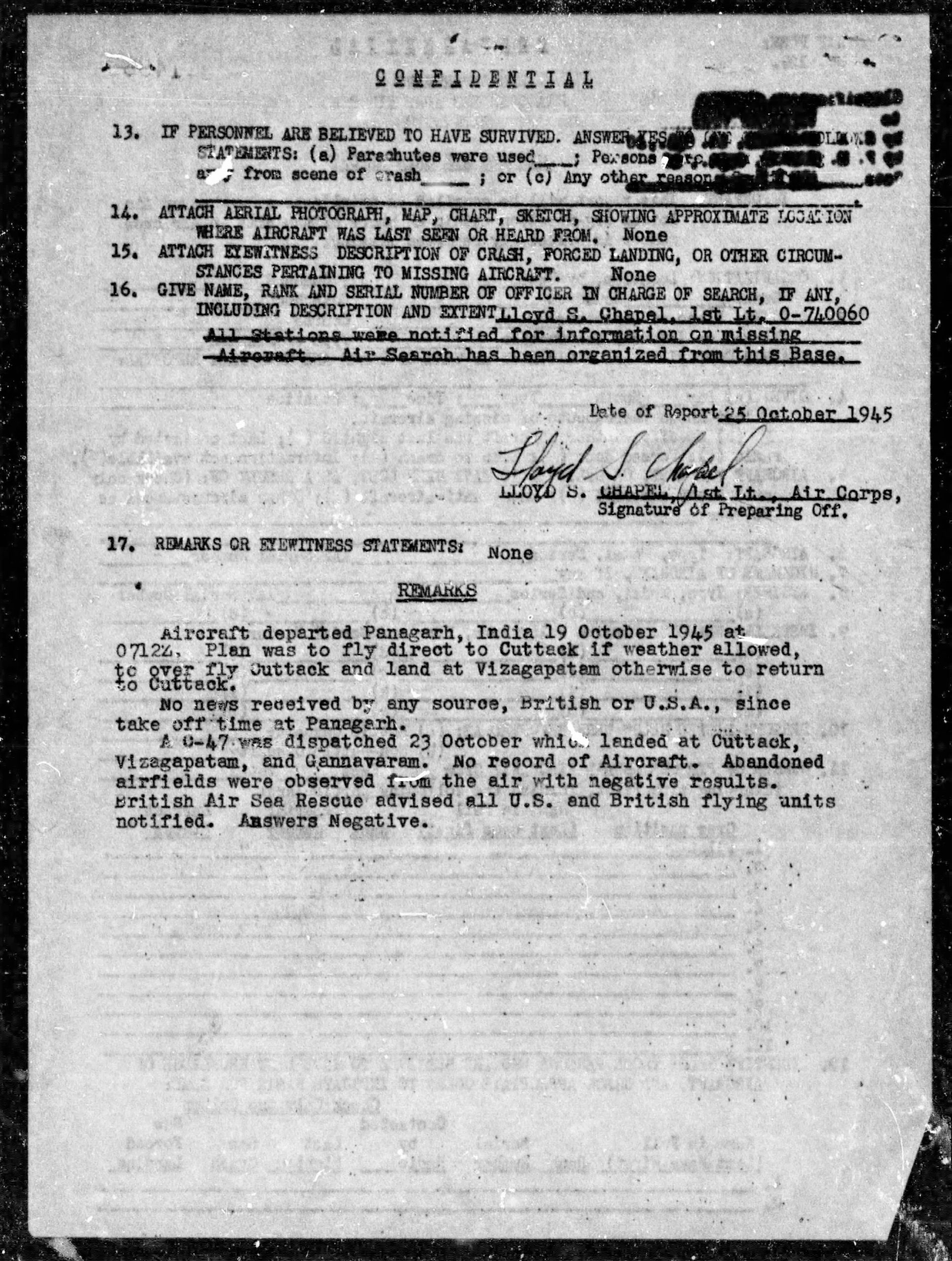 Joseph Mackey was an engineer on aircraft B-25D with serialnumber 43-3668. The aircraft departed from Panagarh, India on 19 October 1945 at 0712Z. Plan was to fly direct to Cuttack if weather allowed to over fly Cuttack and land at Vizagapatam otherwise to return to Cuttack. No news was received by any source, British or U.S.A., since take off time at Panagarh. A C-47 was dispatched 23 October which landed at Cuttack, Vizagapatam, and Gannavaram. No records of Aircraft. Abandoned airfields were observed from the air with negative results. British Air Sea Rescue advised all U.S. and British flying units notified. Answers negative.