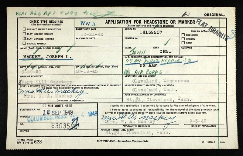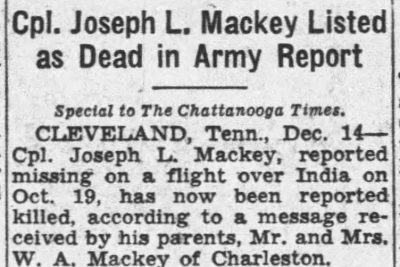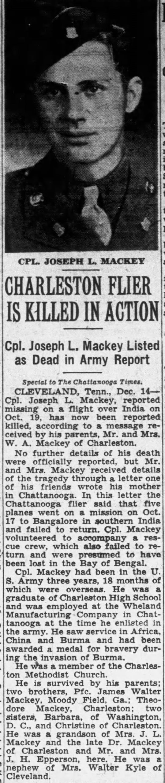 Cpl. Joseph L. Mackey, reported missing on a flight over India on Oct. 19, has now been reported killed, according to a message received by his parents, Mr. and Mrs. W.A. Mackey of Charleston. No further details of his death were officially reported, but Mr. and Mrs. Mackey received details of the tragedy throught a letter one of his friends wrote his mother in Chattanooga. In this letter the Chattanooga flier said that five planes went on a mission on Oct. 17 to Bangalore in southern India and failed to return. Cpl. Mackey volunteered to accompany a rescue crew, which also failed to return and were presumed to have been lost in the Bay of Bengal.