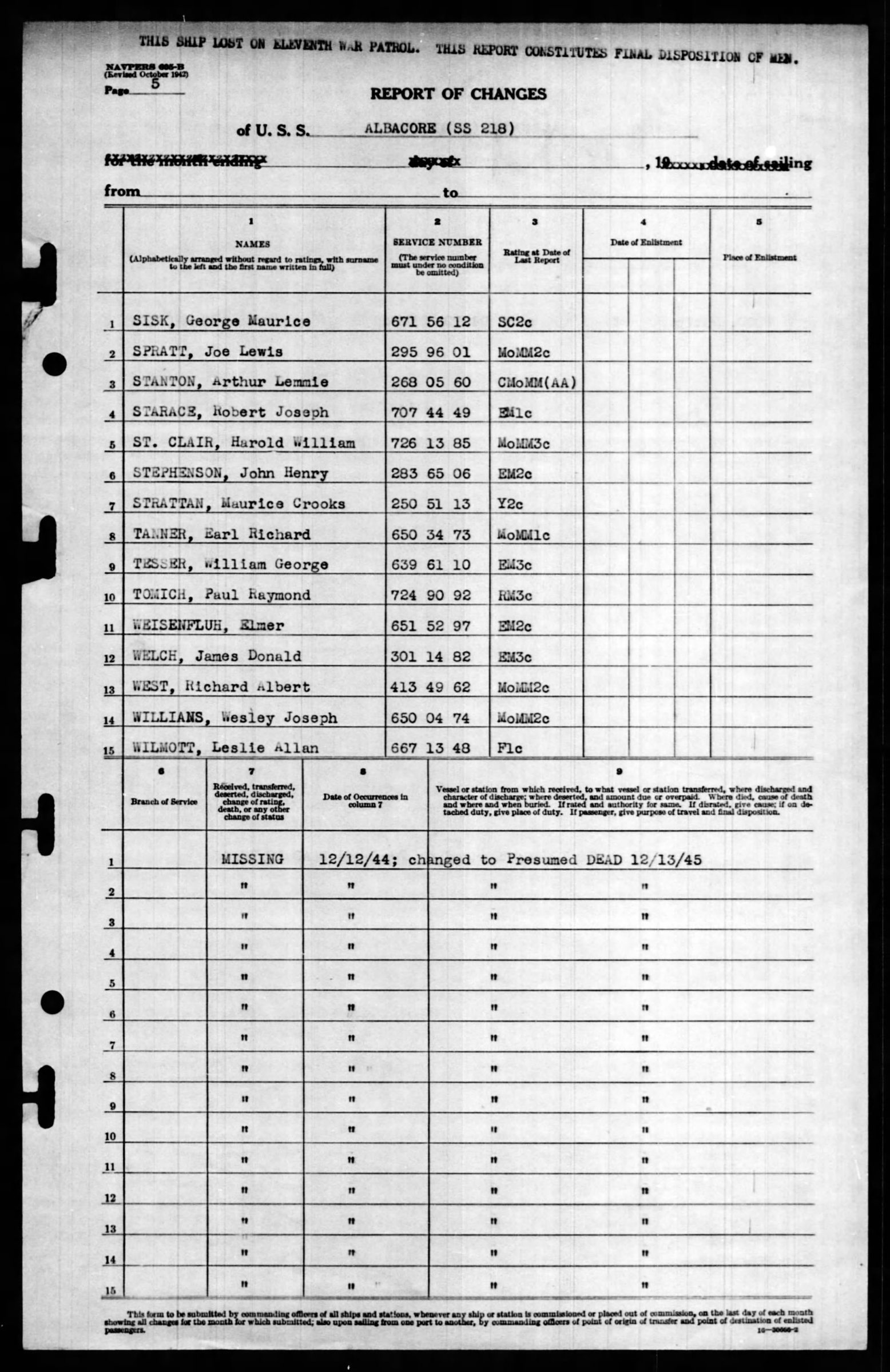 “As commander of Submarine Division of which the u.S.S. Albacore was assigned, I wish to express to you, my sympatjy that your son, Joe L. Spratt, motor machinist mate second class, U.S. Navy, has been reported missing in action on board that gallant fighting ship. The U.S.S. Albacore failed to return as scheduled from an offiensive war patrol in heavily patrolled enemy waters. SInce no word has been heard from her, and no information has been received to date concerning any survivors it is regretted that all hands on board must be considered missing. In recognition of your son’s performance of duty and conduct of operations against the enemy, the Commander Submarine Force, Pacific Fleet, has awarded him the Submarine Combat Insignia and a Citation in Absentia.”