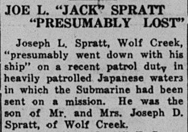 Joseph Lewis Spratt, Wlf Creek, presumably went down with his ship on a recent control duty in heavily patrolled Japanese waters in which the Submarine had been sent on a mission. He was the son of Mr. and Mrs. Joseph D. Spratt, of Wolf Creek.