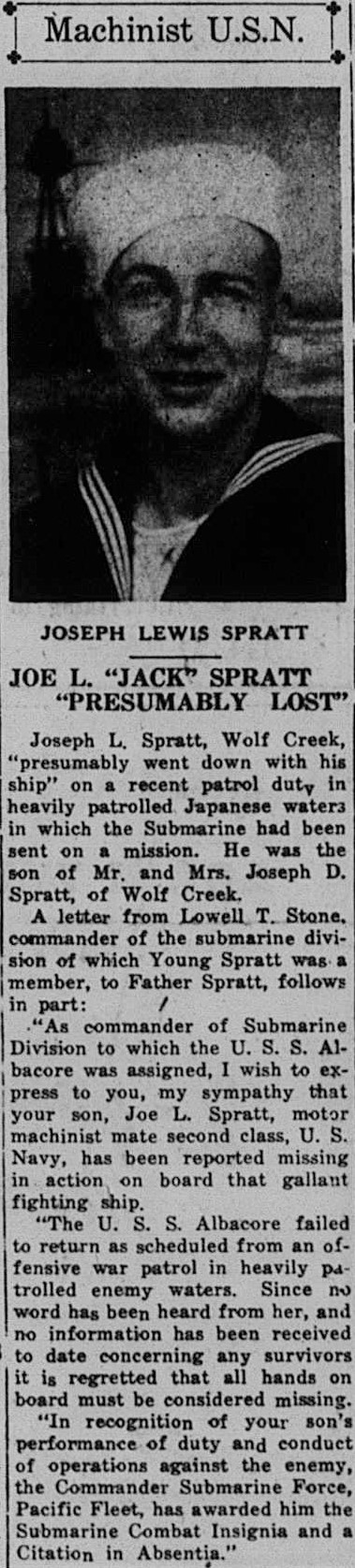 Joseph Lewis Spratt, Wlf Creek, presumably went down with his ship on a recent control duty in heavily patrolled Japanese waters in which the Submarine had been sent on a mission. He was the son of Mr. and Mrs. Joseph D. Spratt, of Wolf Creek.