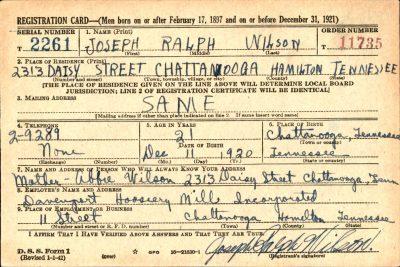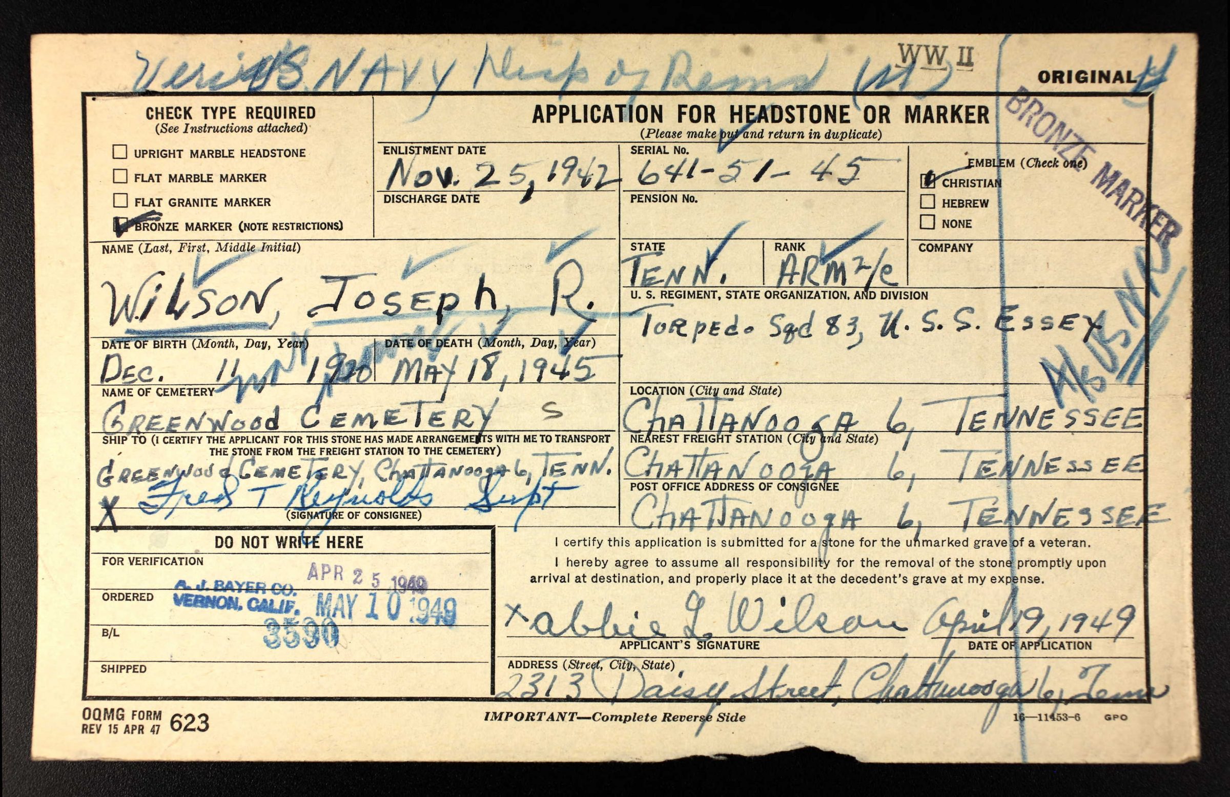 Listed killed in action was Joseph R. Wilson, ARM2C, son of Mrs. Abbie Wilson, 2313 Daisy Street. A former employe of the Davenport Hosiery Mill, Wilson, was killed in action while serving with an aircraft carrier crew in the South Pacific, the Navy Department notified his mother. The department informed his mother that his body was buried on an Allied-held island. In the service since November 1942, he was assigned to a carrier crew in the Pacific last March. He was the brother of S1C Wilburn Wilson, stationed in Solomons, Md., and S1C Robert R. Wilson, now in the South Pacific area.