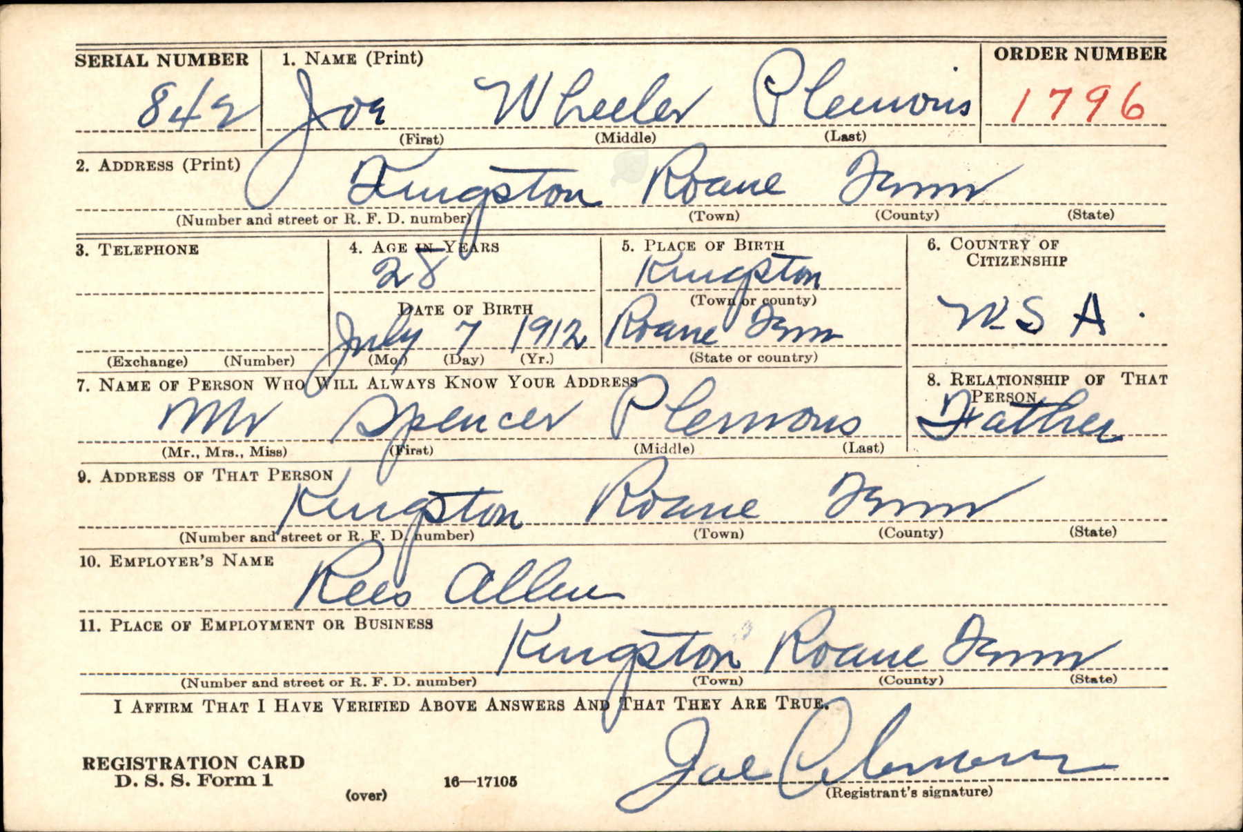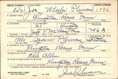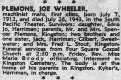 Joseph “Joe” Wheeler Plemons was the son of Spencer Huston Plemons and Nancy Elizabeth “Bettie” Abner. He first married Carrie Miles in 1932. She died 2 days after giving birth to twins in 1935. The twins, Josephine and Joseph Plemons both died when they were 9 months old. He married Edna Imogene Duncan in 1940 and they were the parents of a daughter, Edna Jo.
