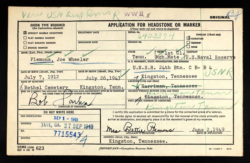 - Burial/Memorial Location: Bethel-Kingston Cemetery, Roane County, TN