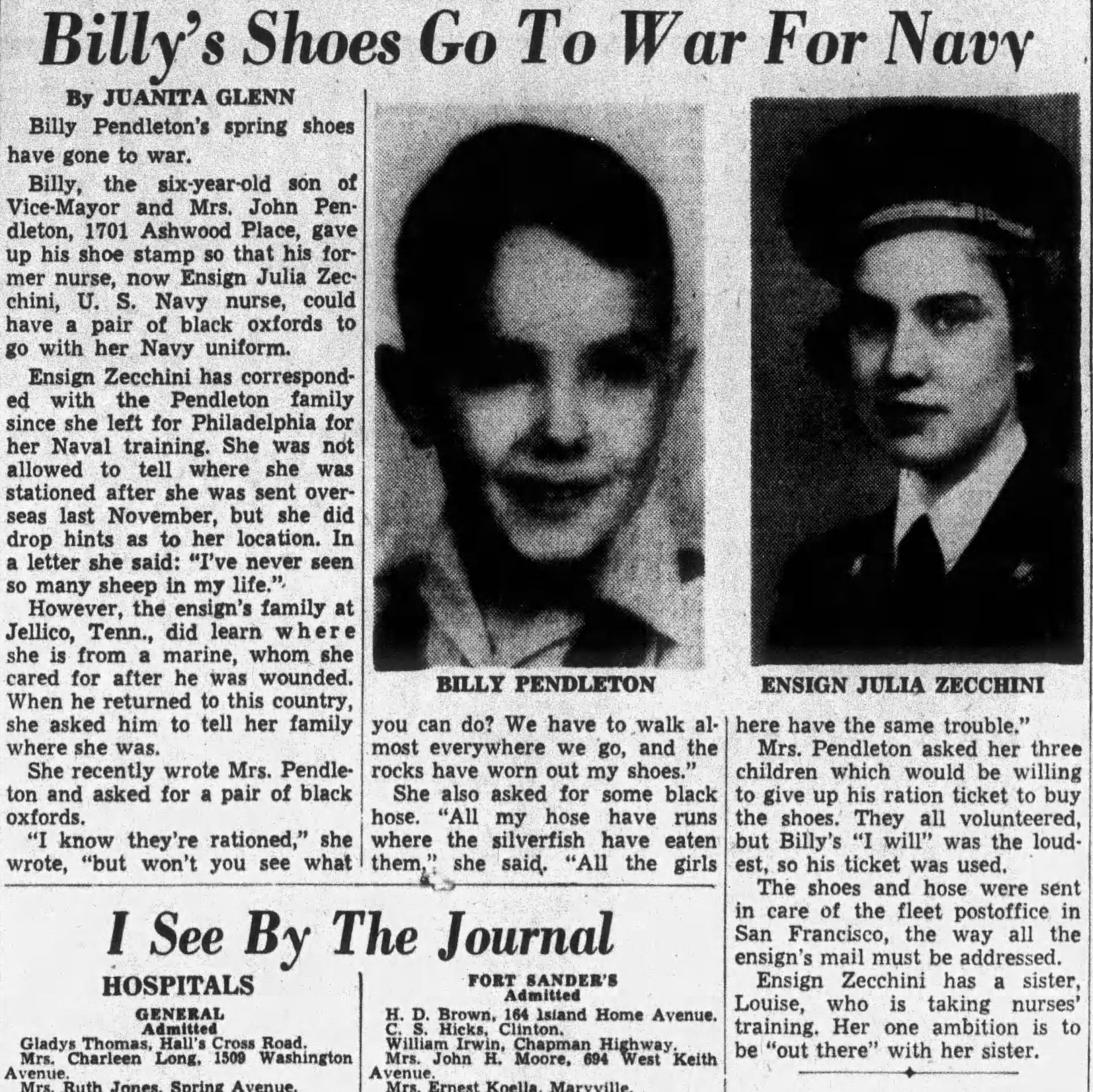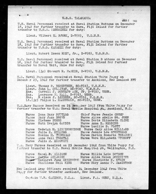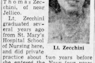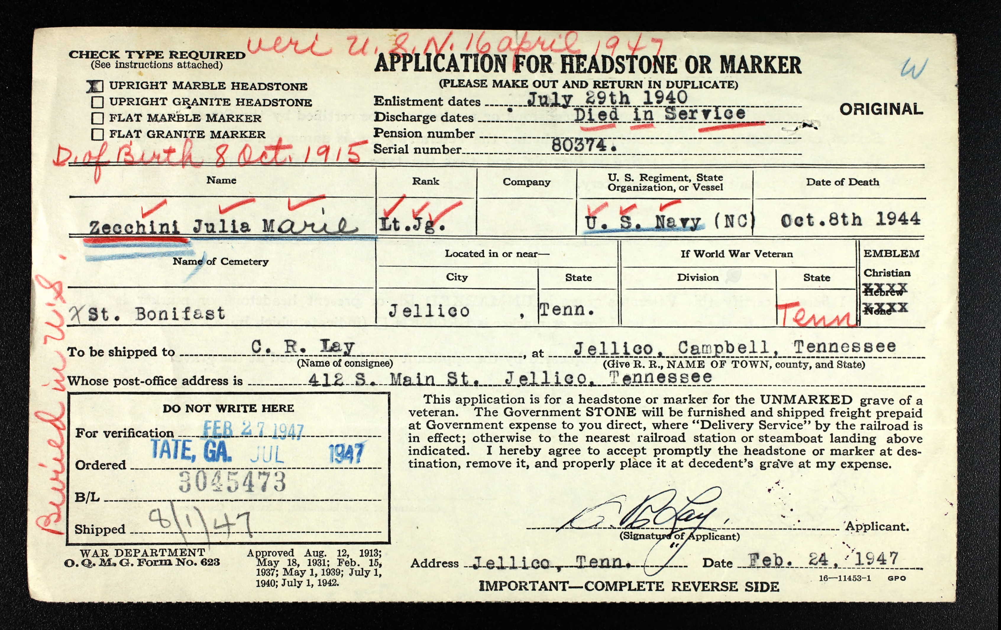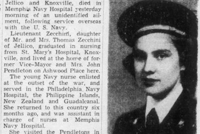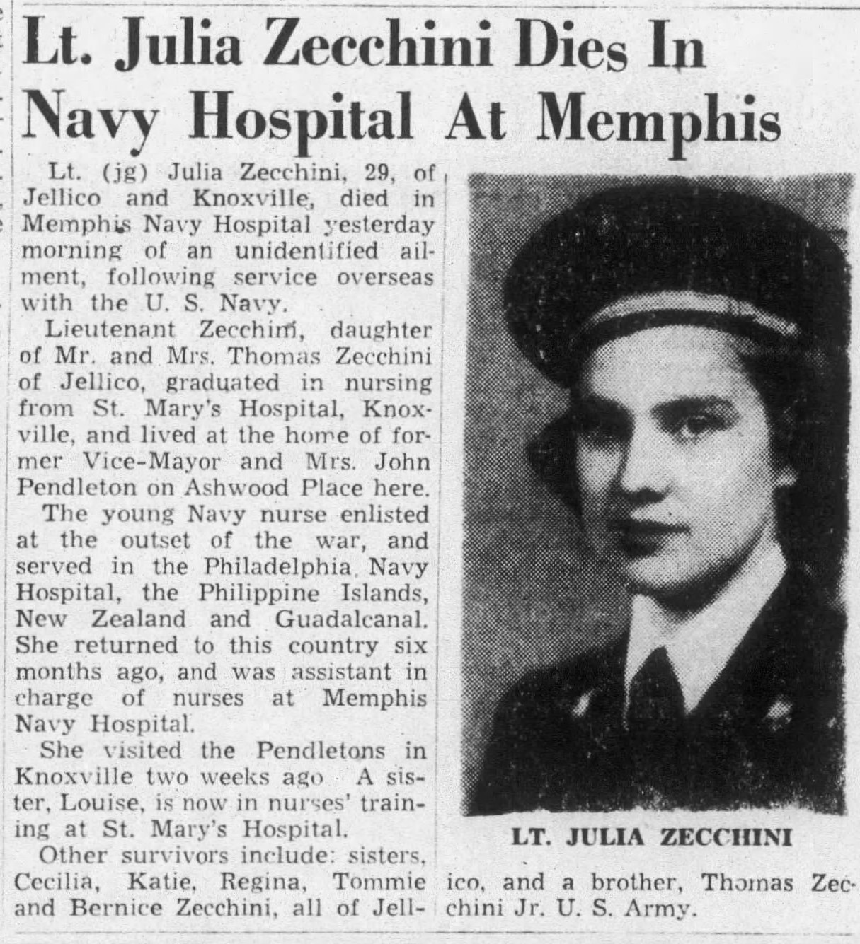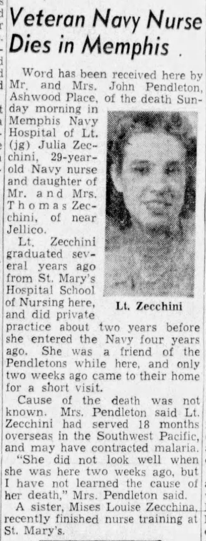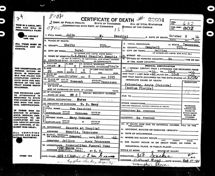 Julie Zecchini died on 8 October 1944 at the U.S. Naval Hospital Memphis, Shelby County, Tennessee of sodium fluoride poisoning. She was a passenger on the U.S.S. Talamanca in 1942, to be transferred to the U.S. Naval Mobile Hospital #4 in Auckland, New Zealand.