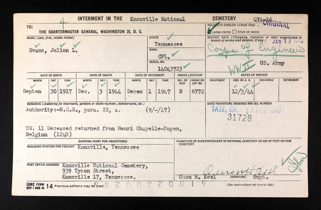 Corporal Julian L. Evans of Burrville, TN, was killed in action in Germany while serving with the Corps of Engineers. He was returned to the United States on December 1, 1947, and was laid to rest at the U.S. National Cemetery in Knoxville, B, 6772.