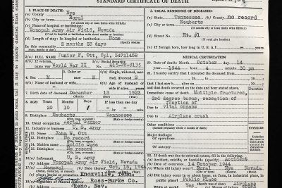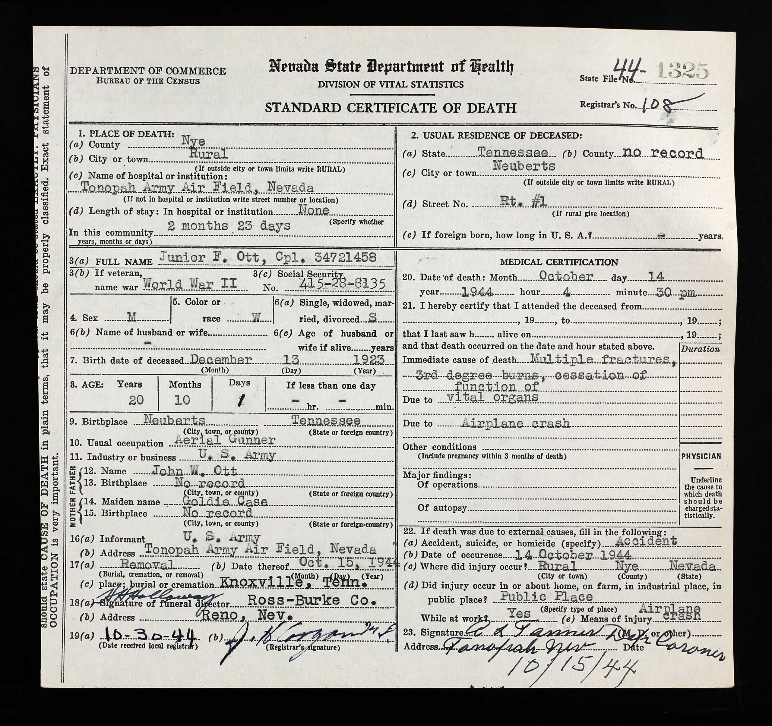 Corporal Ott was killed in the crash of B-24D Liberator #42-40166, five miles northeast of Tonopah Army Airfield, Nevada. Four officers and four enlisted men died in the cash.