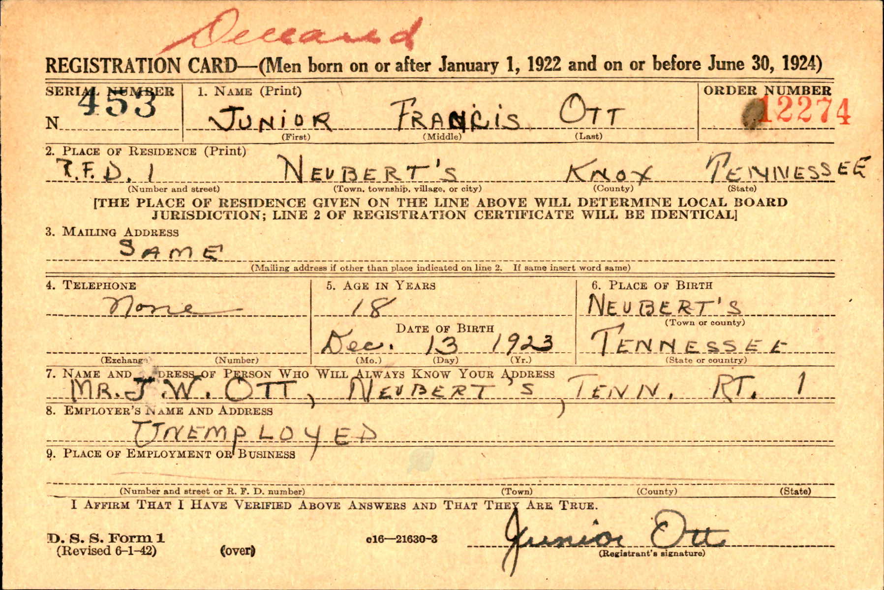 Junior Francis Ott was born in Neuberts, Tennessee, the son of John Walker Ott and Goldie Lucille Case. My father was also Junior’s brother, Joseph Dee Ott, Sr. Brother of Alma Louisa Ott, David William Walker Ott, Curtis Ray Ott, Homer E. Ott. He enlisted on February 12, 1943 in Fort Oglethorpe, GA.