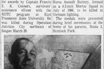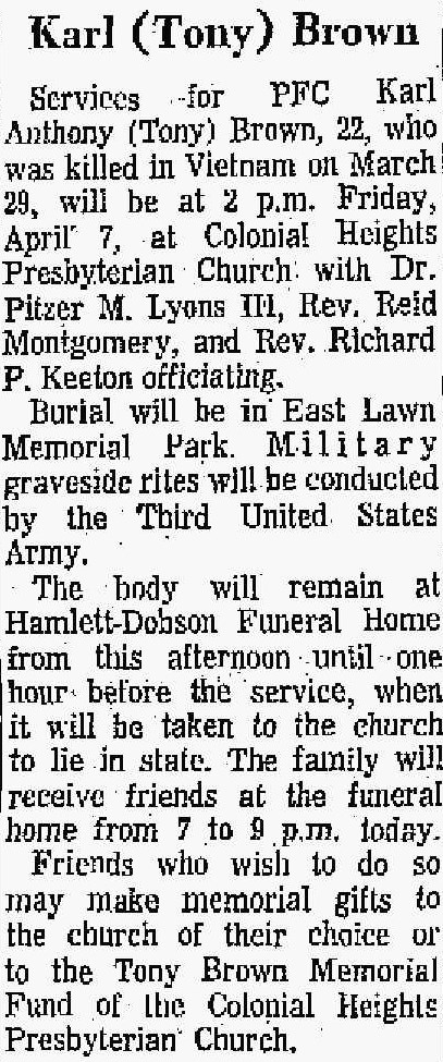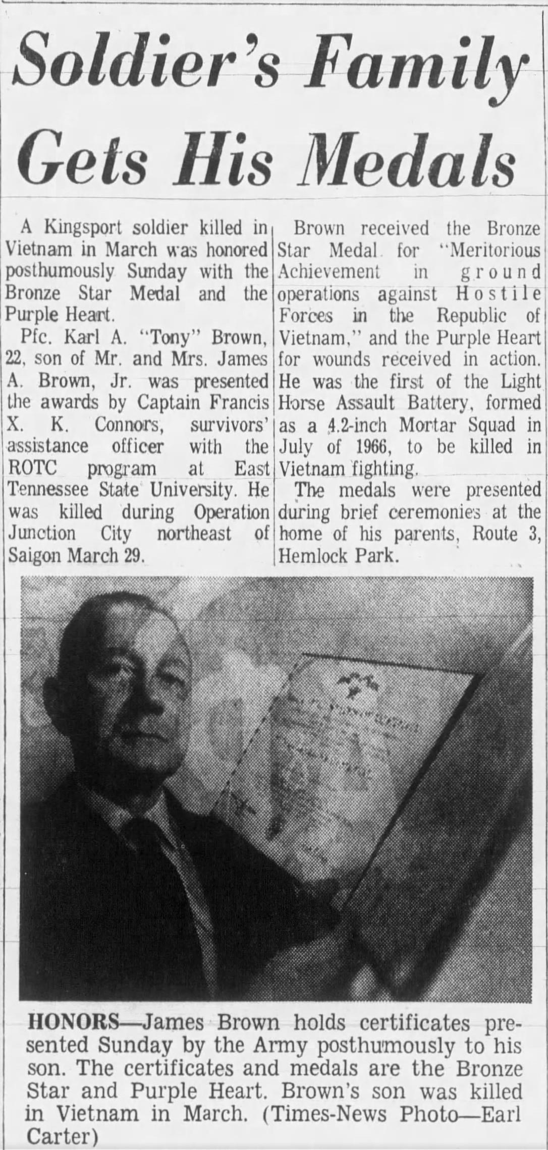 Pfc. Karl A.nthony “Tony” Brown, 22, son of Mr. and Mrs. James A. Brown Jr., was presented the Bronze Star Medal and the Purple Heart posthumously. The awards were presented by Captain Francis X.K. Connors. Pfc. Brown was killed during Operation Junction City northeast of Saigon March 29. Brown received the Bronze Star Medal for “Meritorious Achievement in ground operations against Hostile Forces in the Republic of Vietnam,” and the Purple Heart for wounds received in action. He was the first of the Light Horse Assault Battery, formed as a 4.2-inch Mortar Squad in July of 1966, to be killed in Vietnam fighting. The medals were presented during brief ceremonies at the home of his parents, Route 3, Hemlock Park.