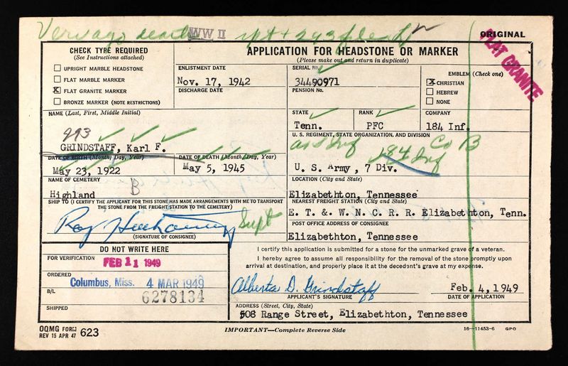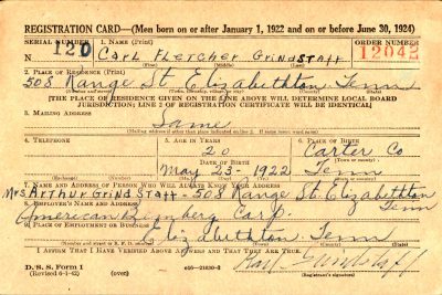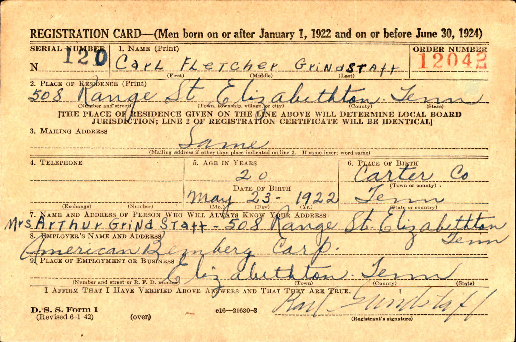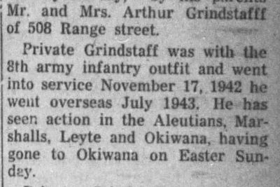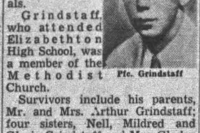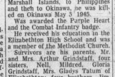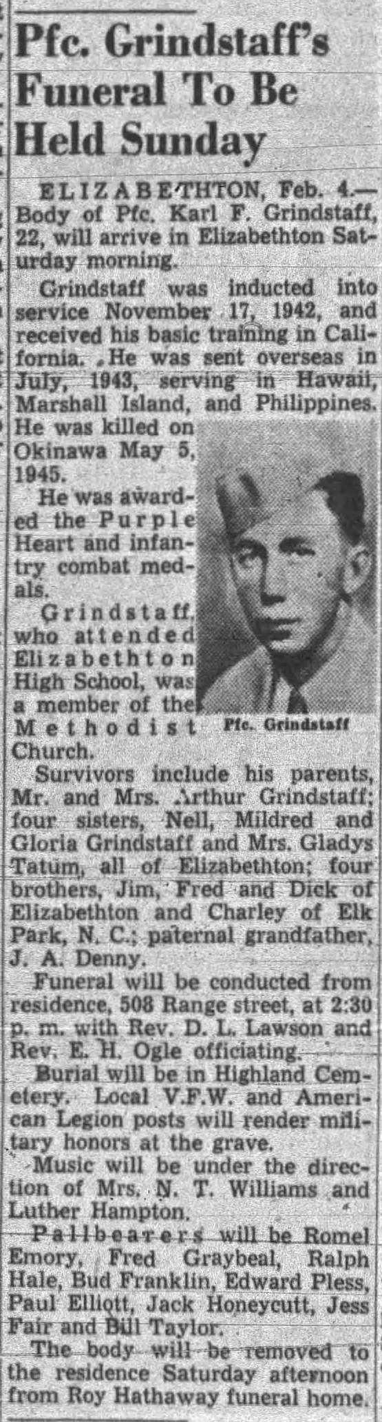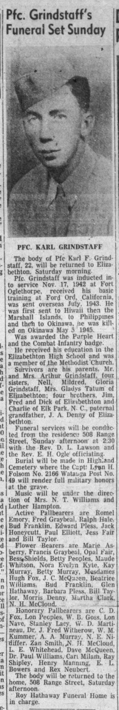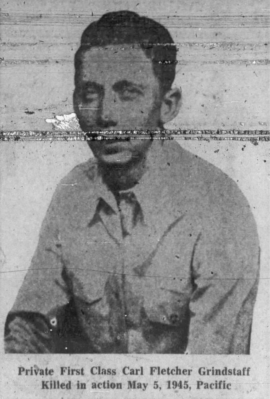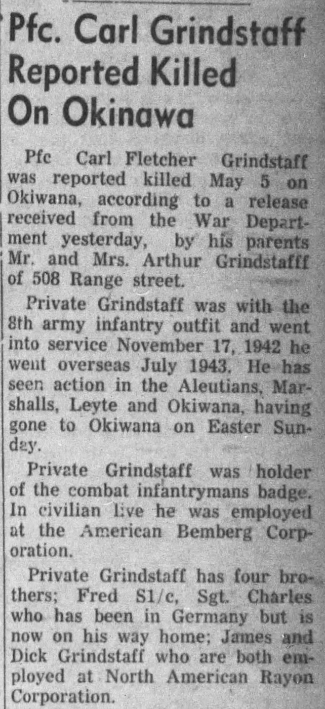 Pfc Carl Fletcher Grindstaff was reported killed May 5 on Okinawa, according to a release received from the War Department yesterday, by his parents Mr. and Mrs. Arthur Grindstaff of 508 Range street. Private Grindstaff was with the 8th army infantry outfit and went into service November 17, 1942, he went overseas July 1943. He has seen action in the Aleutians, Marshalls, Leyte and Okiwana, having gone to Okiwana on Easter Sunday. Private Grindstaff was holder of the combat infantrymans badge. In civilian live he was employed at the American Bemberg Corporation. Private Grindstaff has four brothers; Fred S1/c, Sgt. Charles who has been in Germany but is now on his way home; James and Dick Grindstaff who are both employed at North American Rayon Corporation.