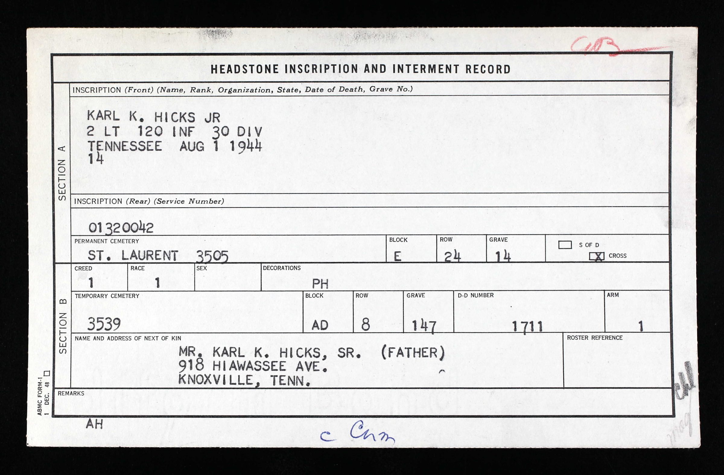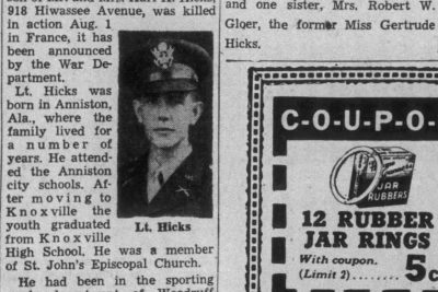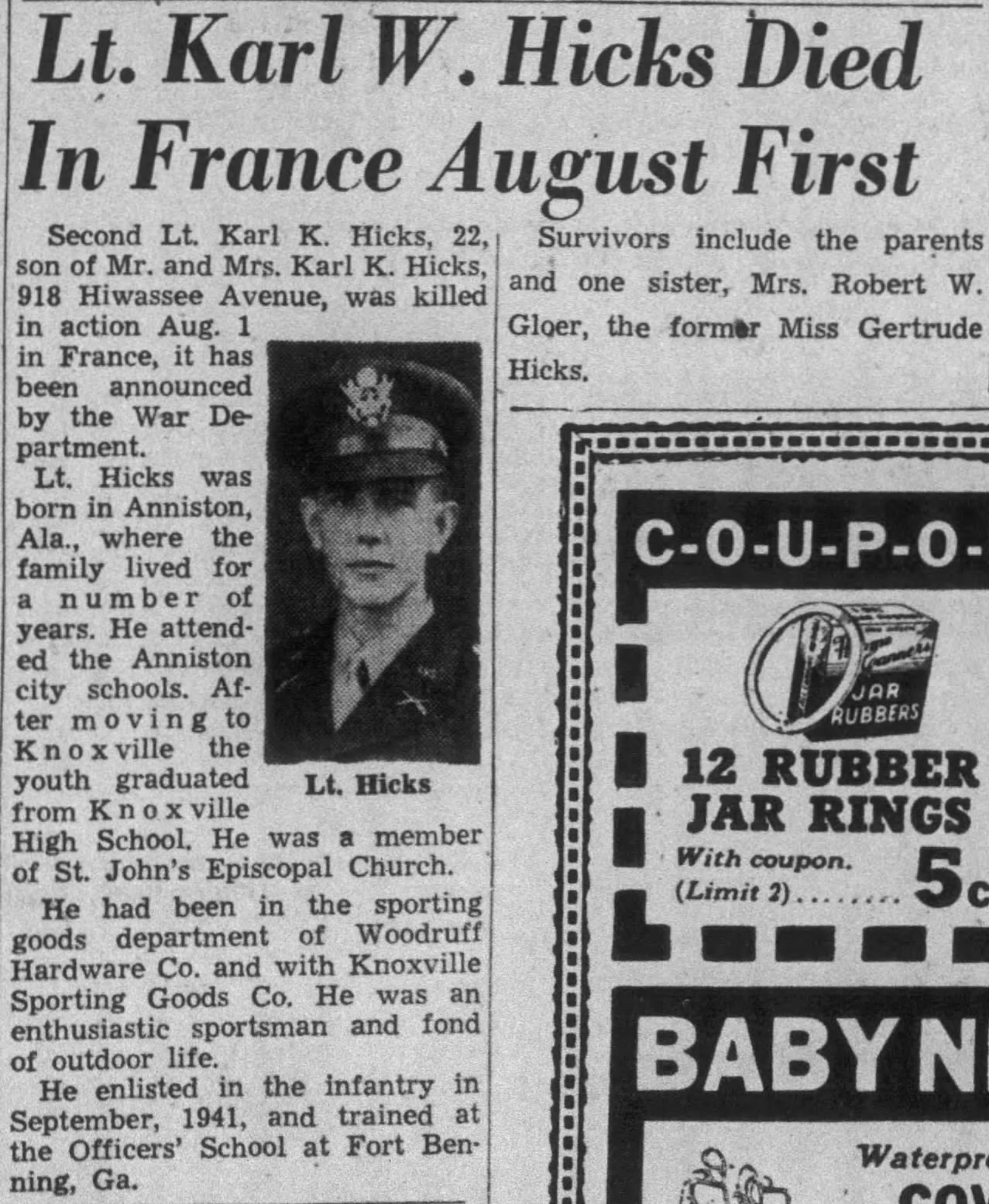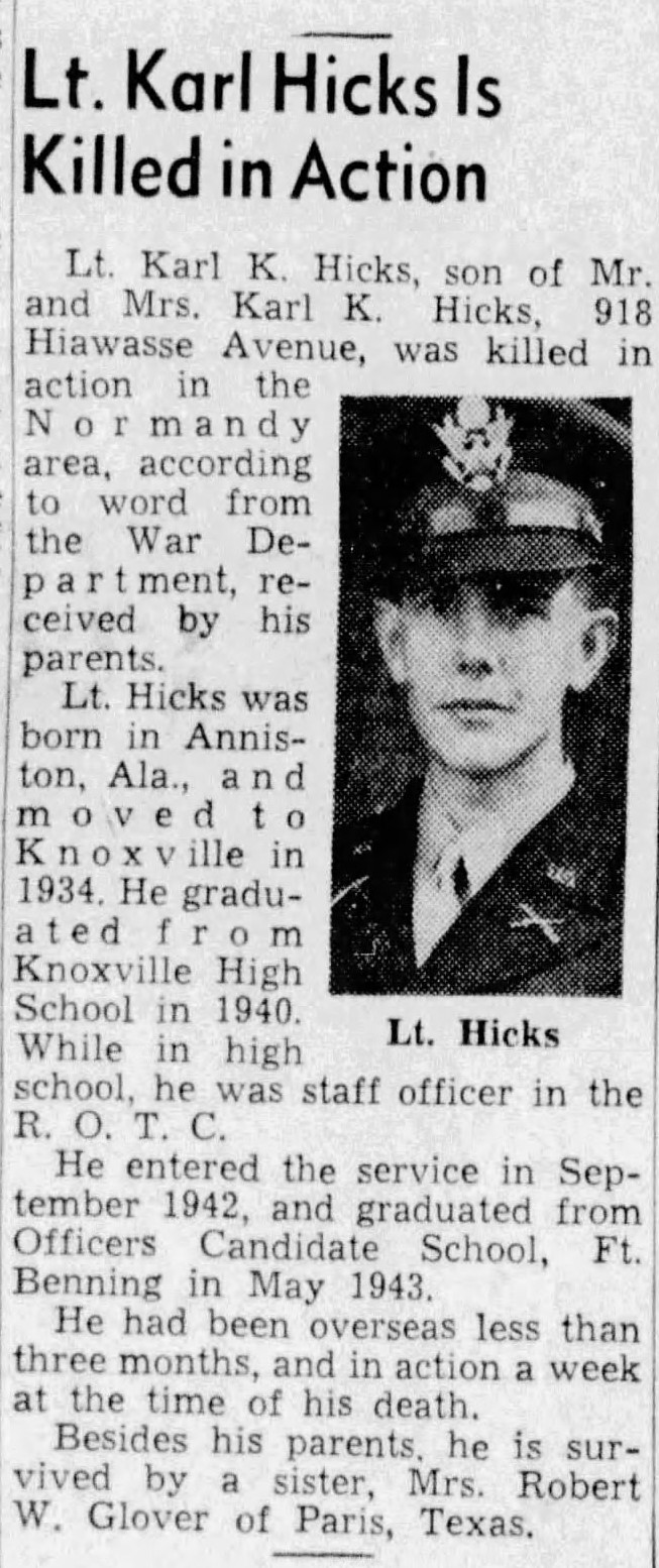 Lt. Karl K. Hicks, son of Mr. and Mrs. Karl K. Hicks, 918 Hiawassa Evenue, was killed in action in Normandy area, according to word from the War Department, received by his parents. Lt. Hicks was born in Anniston, Ala., and moved to Knoxville in 1934. He graduated from Knoxville High School in 1940. While in high school, he was staff officer in the R.O.T.C. He entered the service in September, 1942, and graduated from Officers Candidate School, Ft. Benning in May, 1943. He had been overseas less than three months, and in action a week at the time of his death. Besides his parents, he is survived by a sister, Mrs. Robert W. Glover of Paris, Texas.