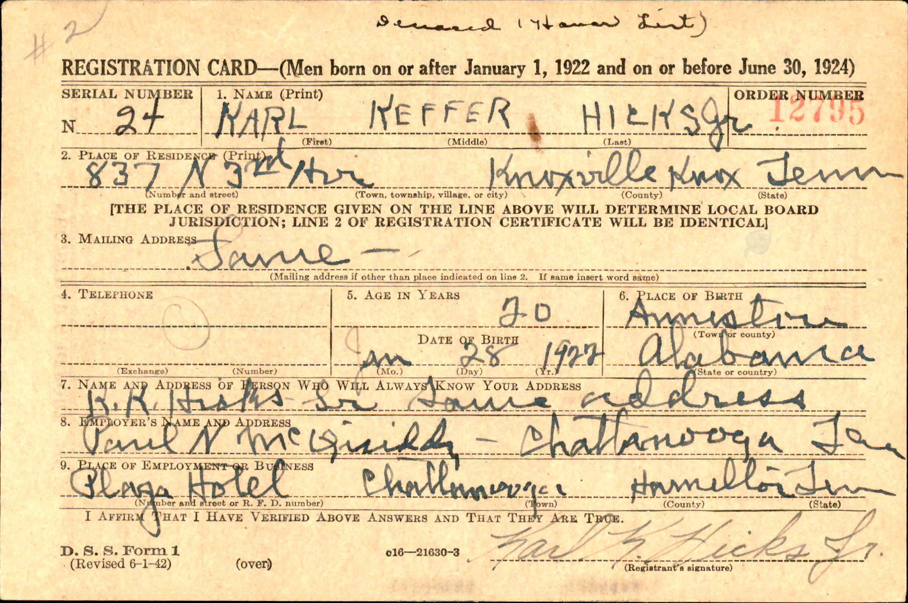 Karl Keffer Hicks was born in 1922 in Anniston, Alabama, the son of Karl Keffer Kicks Sr. and Gladys E. Phillips. He had one sister, Gladys G. Hicks. Karl graduated at Knoxville High School and enlisted on 12 October 1942 in Fort Oglethorpe, GA.
