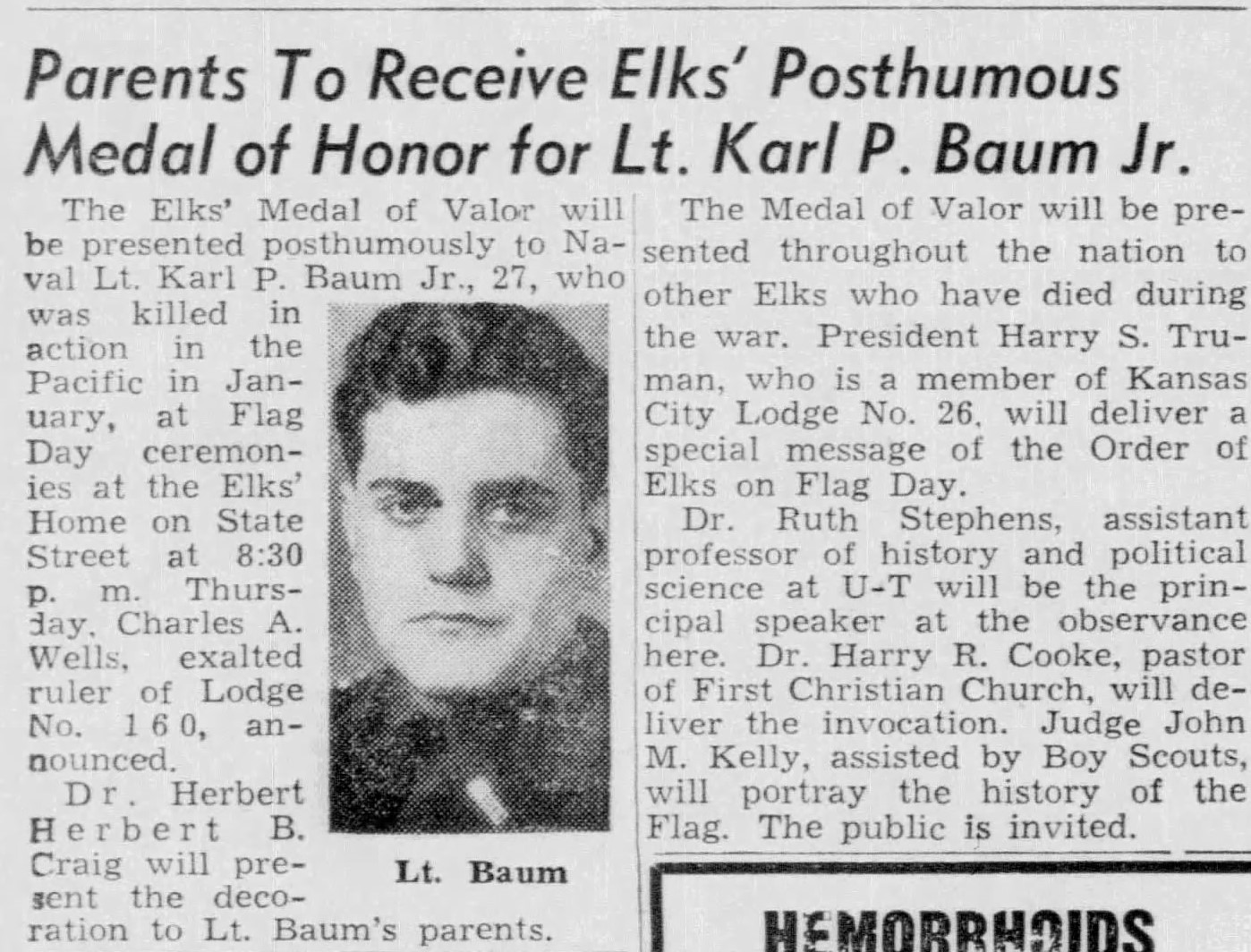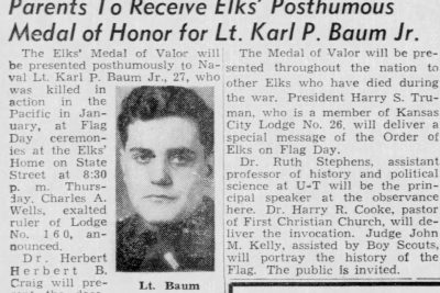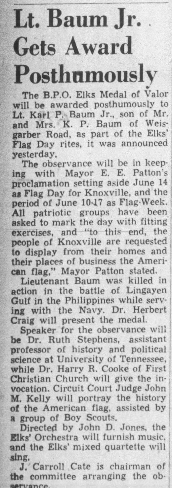 Lieutenant Karl Porter Baum served in the United States Naval Reserve. While on board the USS Colorado in the Lingayen Gulf, he died as a result of accidental gunfire which hit the ship’s superstructure. Eighteen crewmen died and 51 were wounded. Died on 9 January 1945 and was buried at sea.