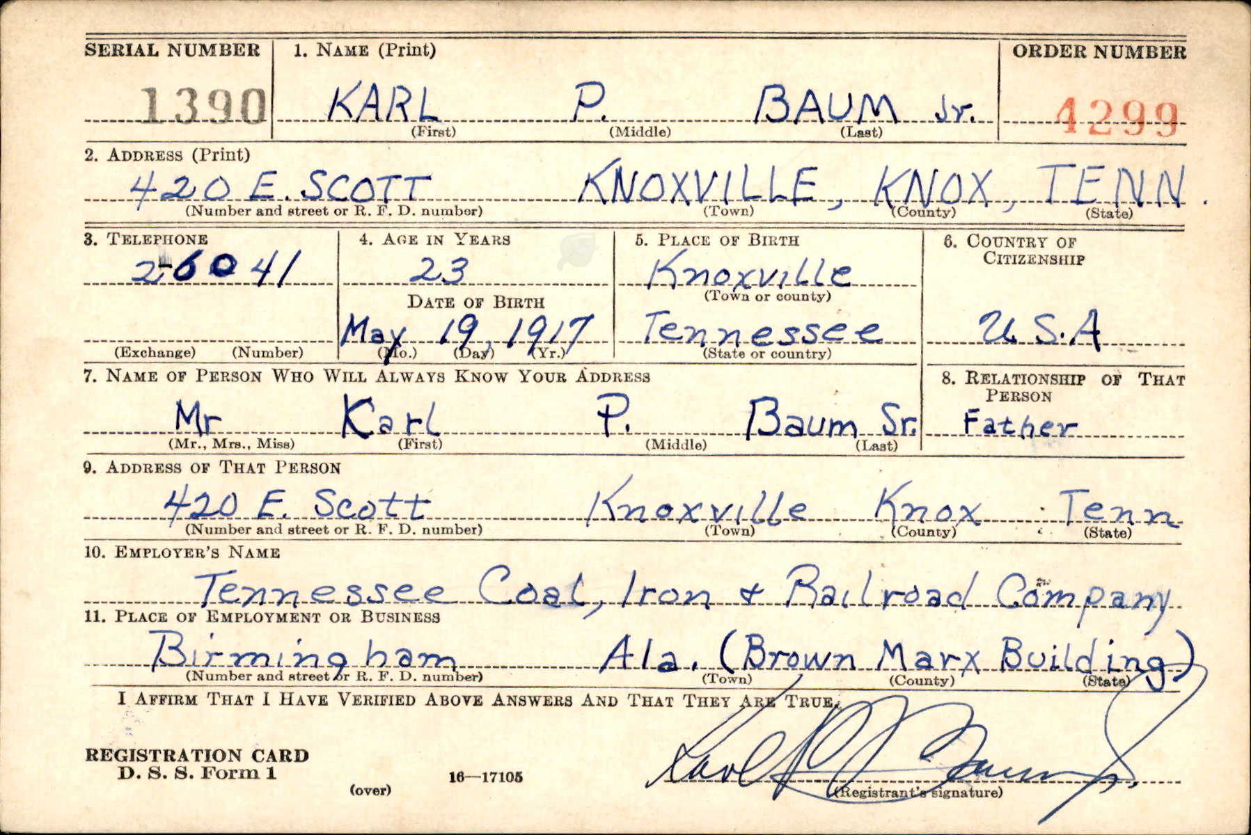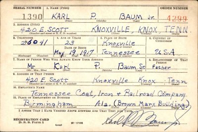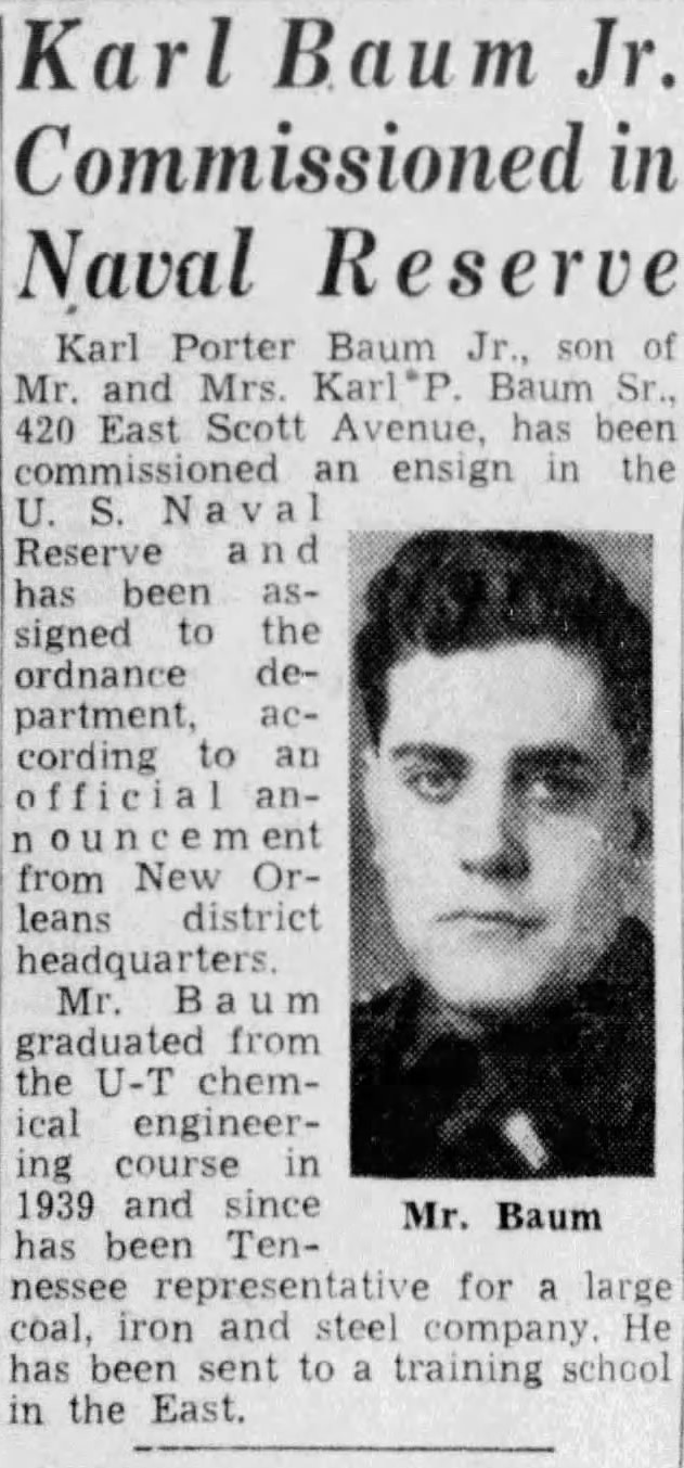 Parents: Mr. and Mrs. Karl Porter Baum Sr, Knoxville, TN.