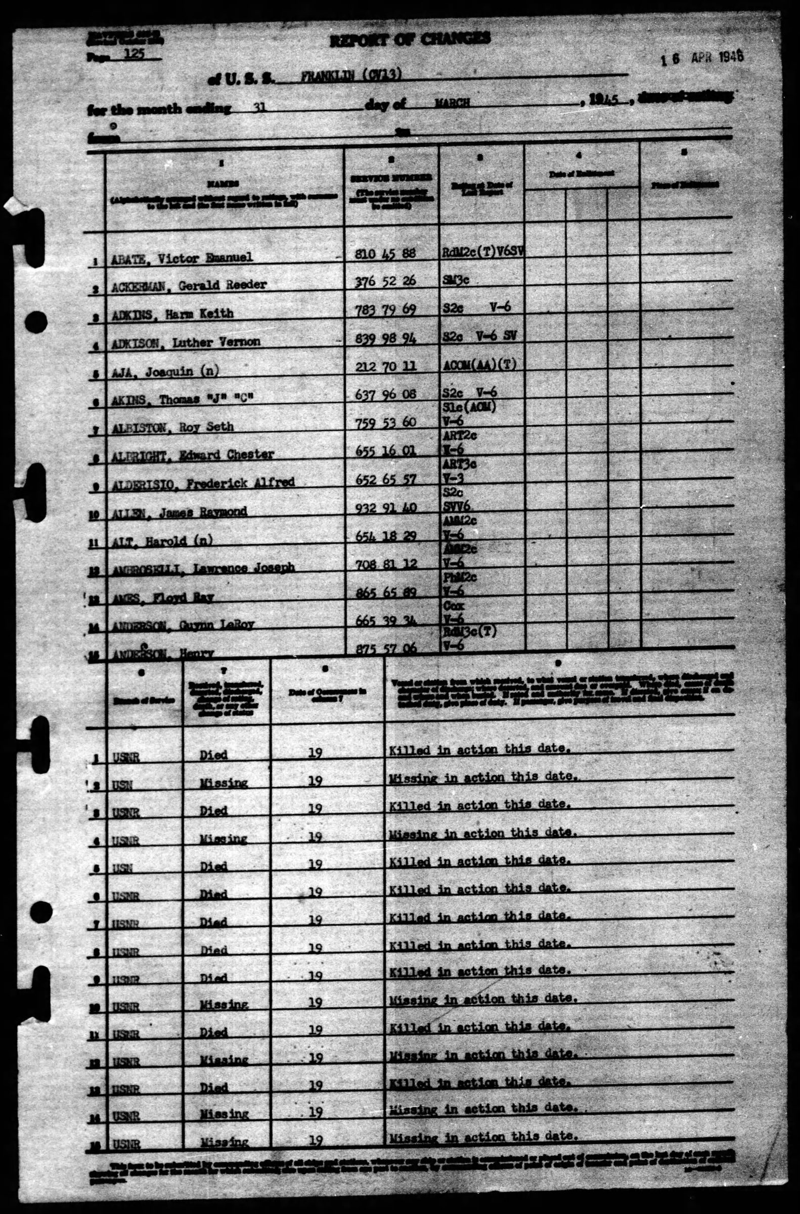 Harm Keith Adkins according to the Navy Casualty book