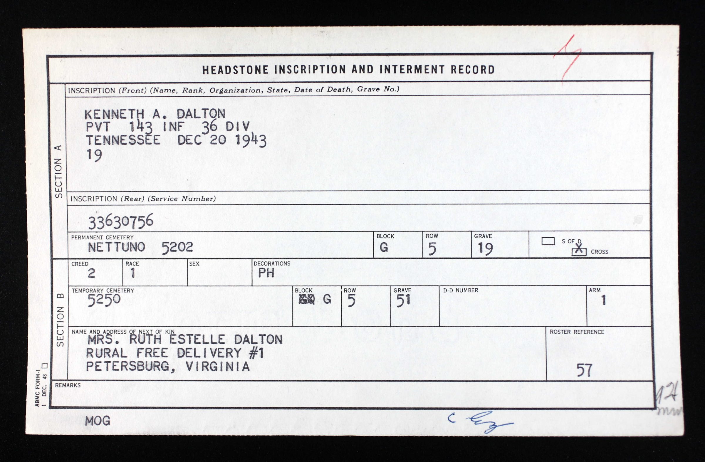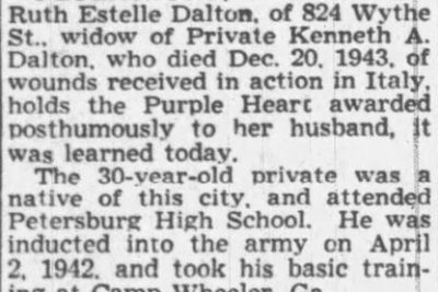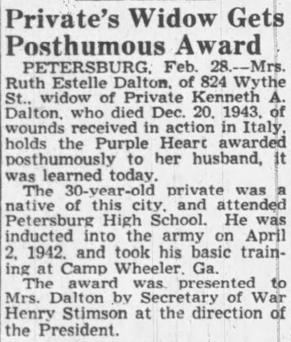 Private Dalton was Killed in Action on the 20th of December 1943. He was initially buried at Marzanello Nuovo Cemetery at Marzanello Nuovo, Italy and reburied at the Sicily-Rome American Cemetery, Nettuno Italy, plot G,row 5, site 19.