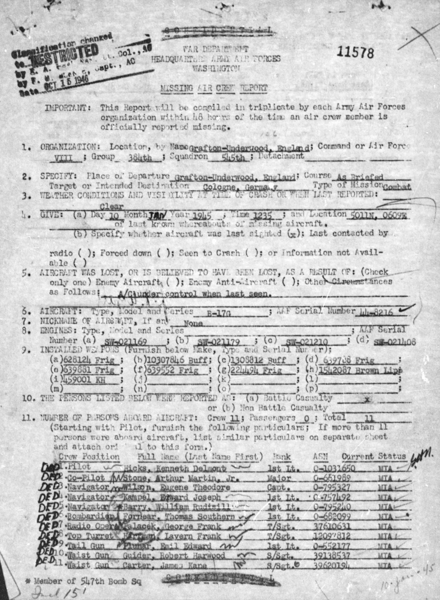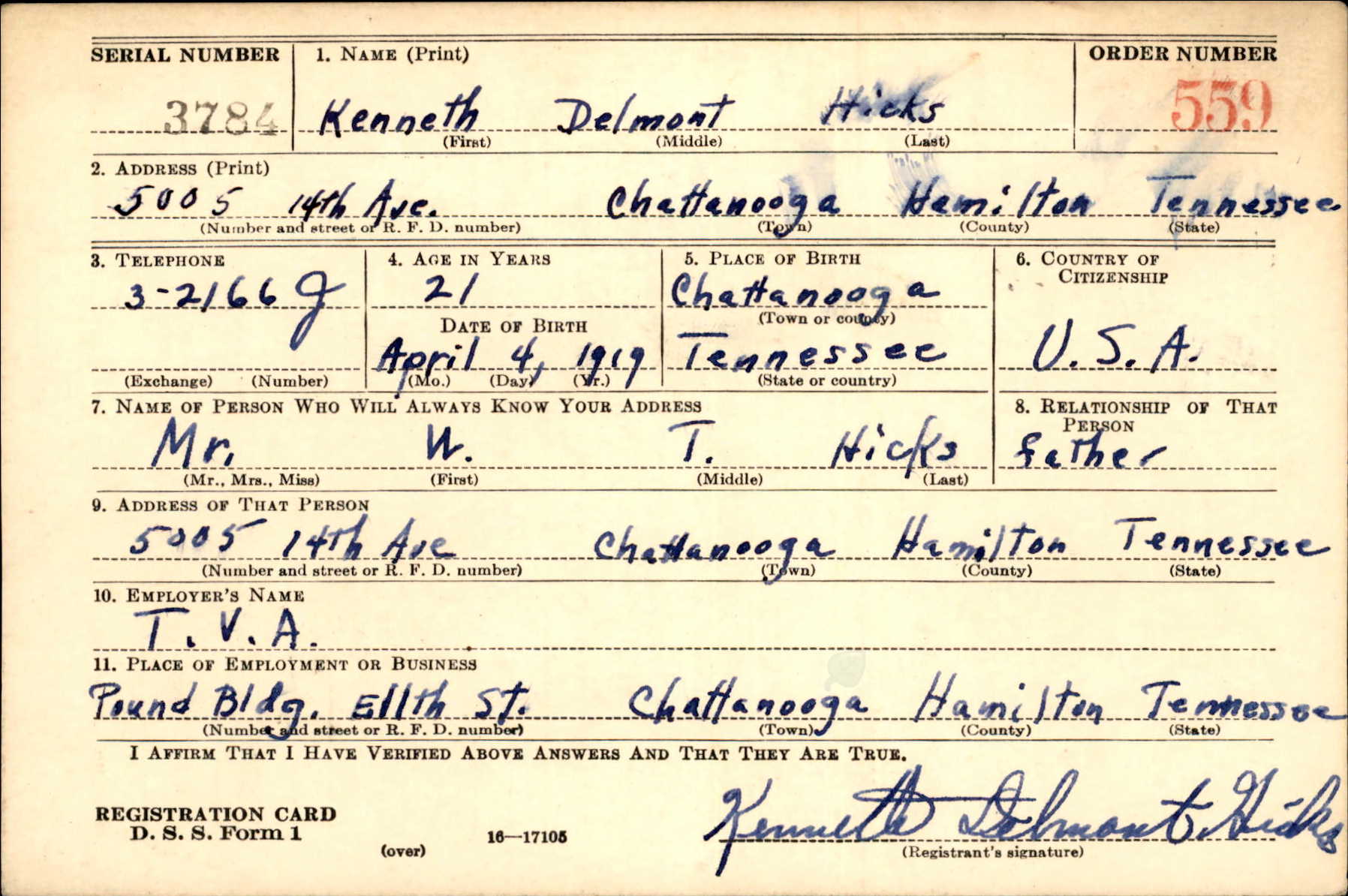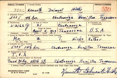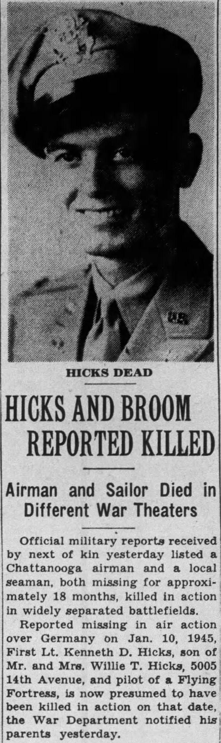 Reported missing in air action over Germany on Jan. 10, 1945, First Lt. Kenneth D. Hicks, son of Mr. and Mrs. Willie T. Hicks, 5005 14th Avenue, and pilot of a Flying Fortress, is now presumed to have been killed in action on that date, the War Department notified his parents yesterday. A former employe of the Tennessee Valley Authority, Lt. Hicks had been in army duty four years. He was assigned to service with the Eighth Air Force in October, 1944 and held the Air Medal for meritorious service while engaged in bomber combat operations over enemy-held Europe. He was a graduate of Central High School, attended Edmondson School of Business in Chattanooga, and was active in church work at McFarland Methodist Church.