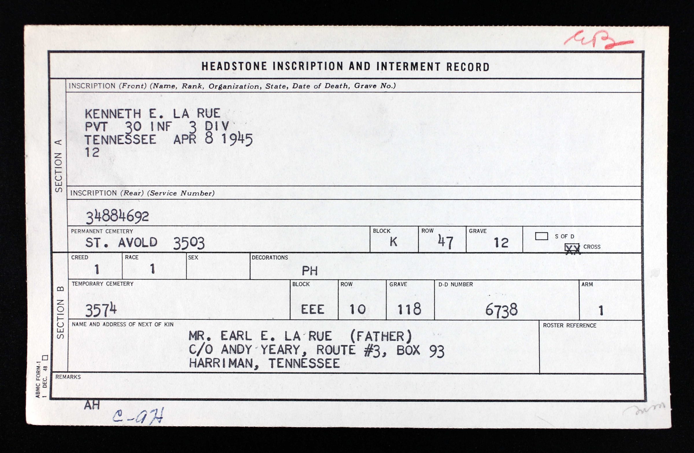 Buried at Lorraine American Cemetery, St. Avold, France, K, 47, 12. He born in 1925 and was the son of Edward Ear LaRue and Zama Letha Brown.
