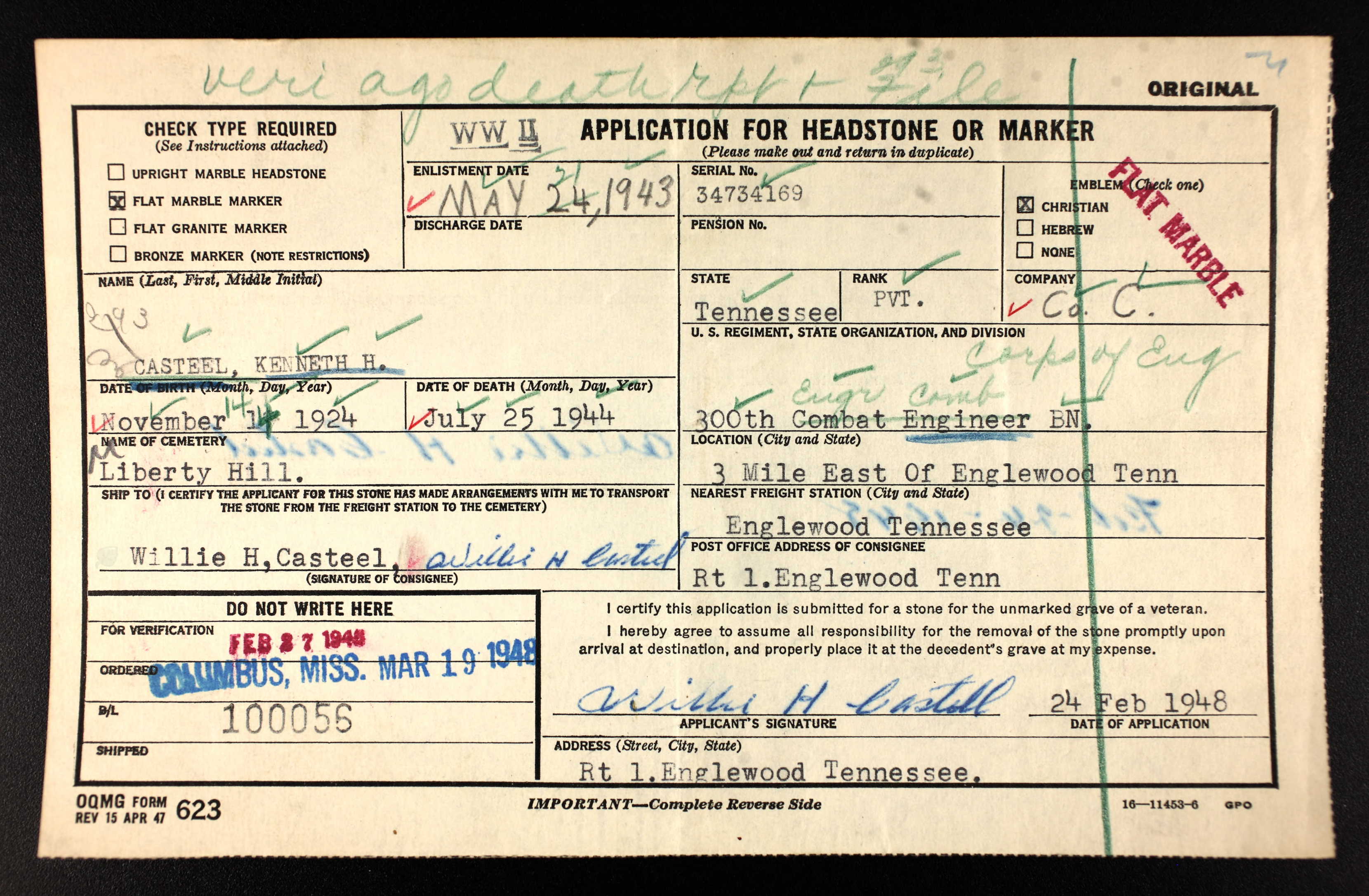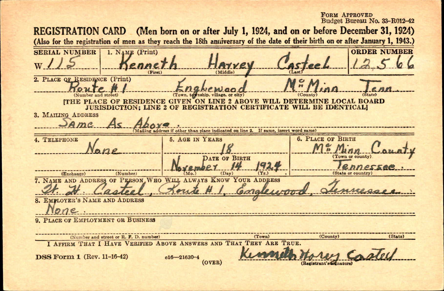 Kenneth Harvey Casteel was born on 14 November 1924, the son of William Henry Casteel and Della Lethcoe.