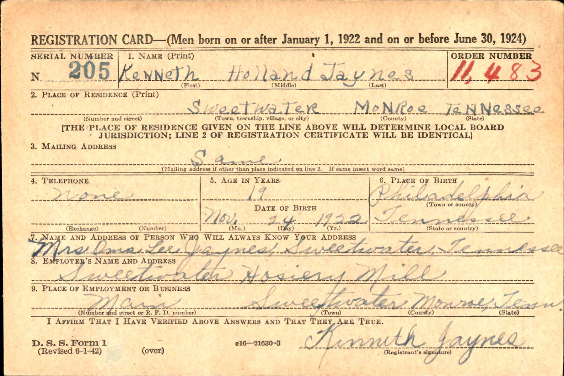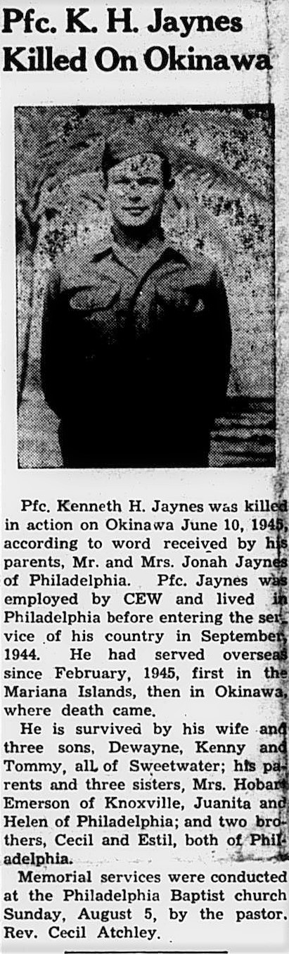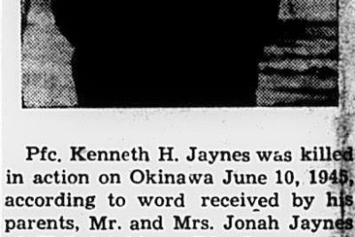 Pfc. Kenneth H. Jaynes was killed in action on Okinawa June 10, 1945, according to word received by his parents, Mr. and Mrs. Johan Jaynes of Philadelphia. Pfc. Jaynes was employed by CEW and lived in Philadelphia before entering the service of his country in September, 1944. He had served overseas since February, 1945, first in the Mariana Islands, then in Okinawa where death came.