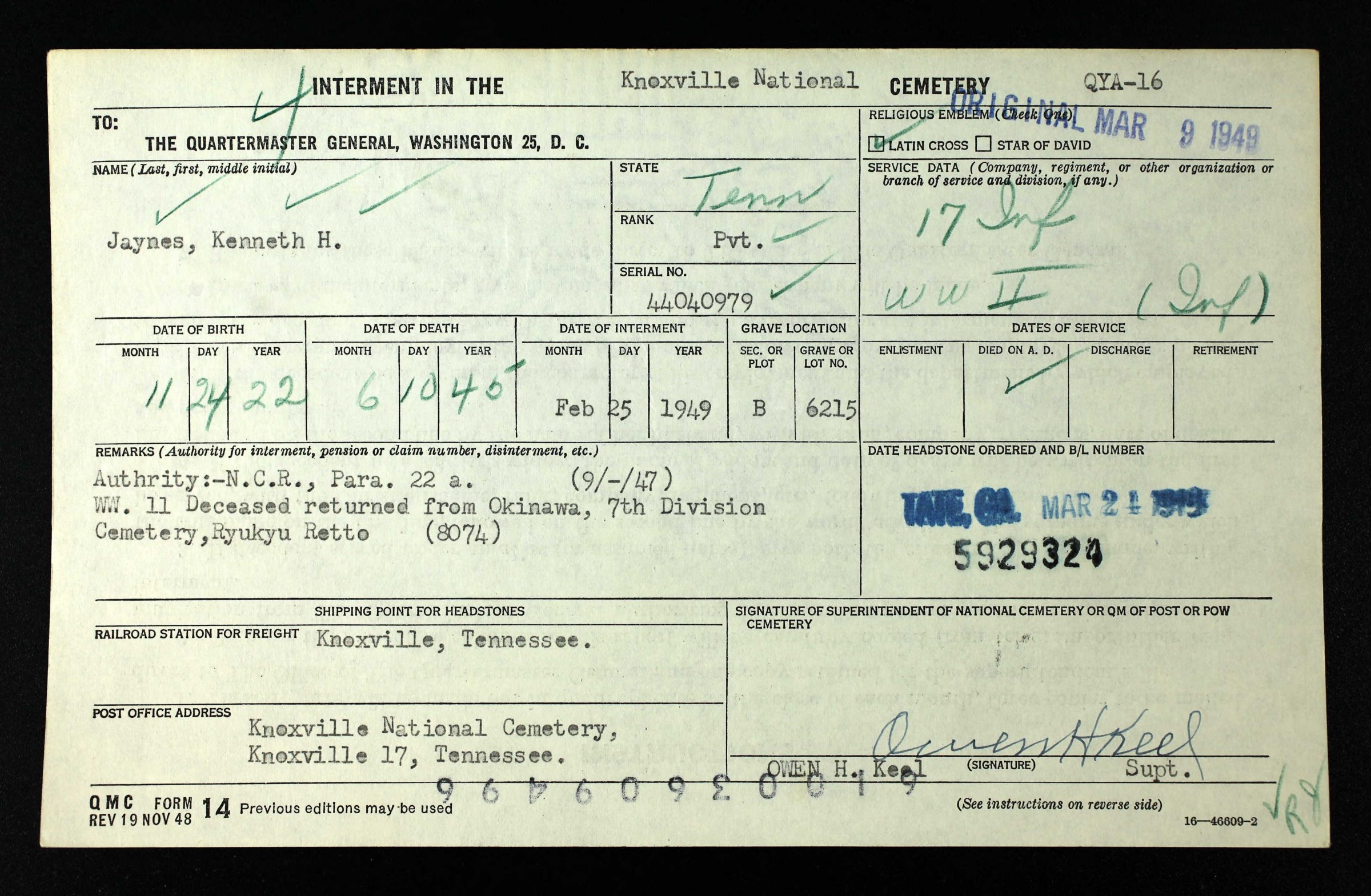 Kenneth Holland Jaynes was initially buried at Okinawa, 7th Division Cemetery, Ryukyu Retto.