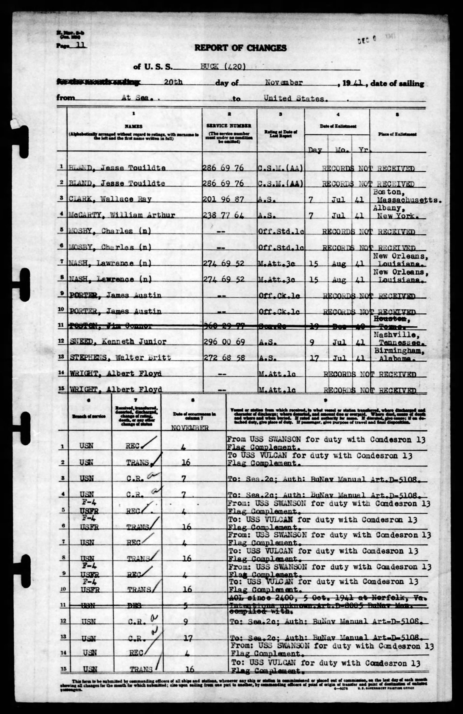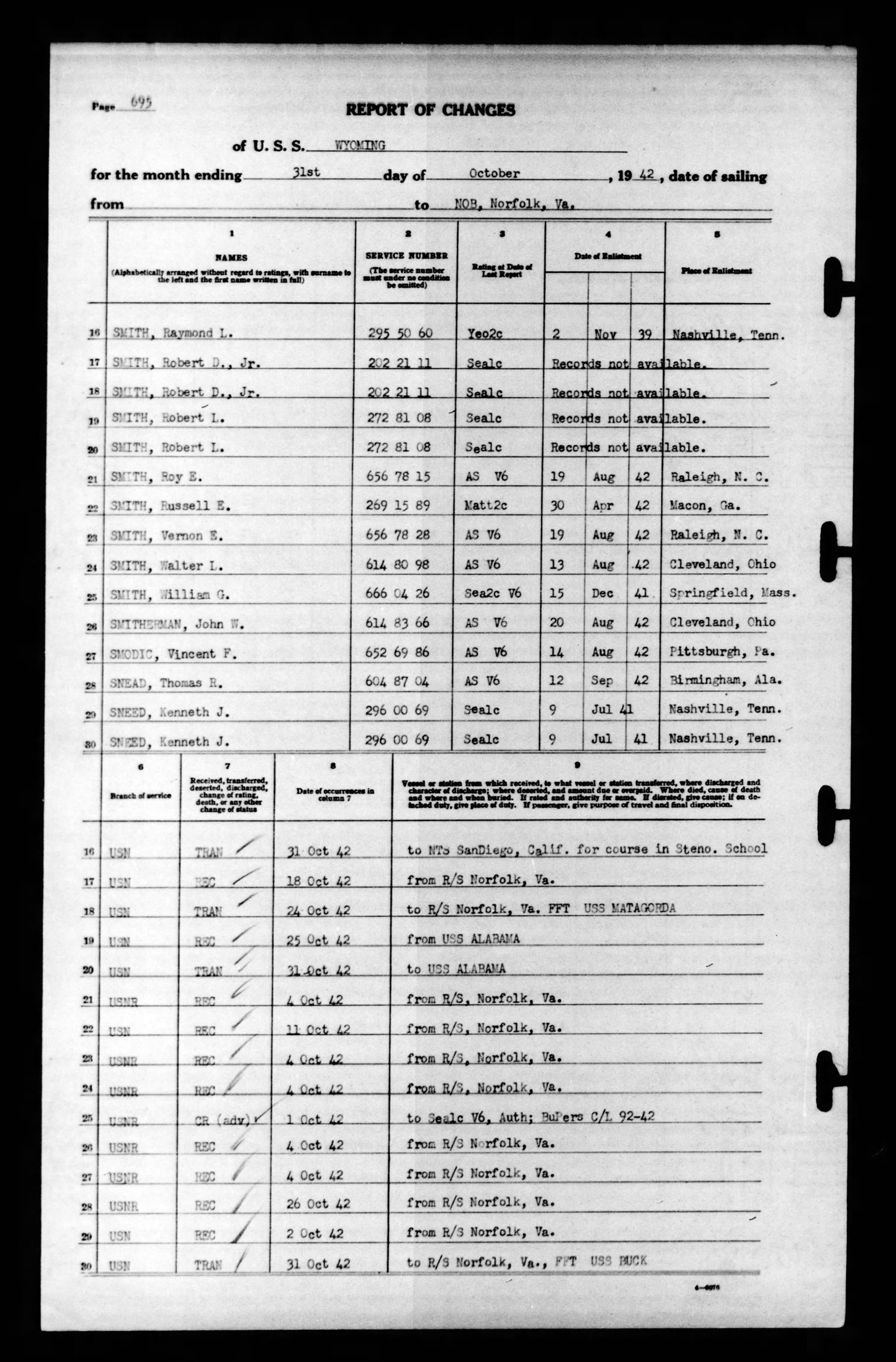 Kenneth Sneed served on the U.S.S. Wyoming and was transferred to the U.S.S. Buck (DD420).