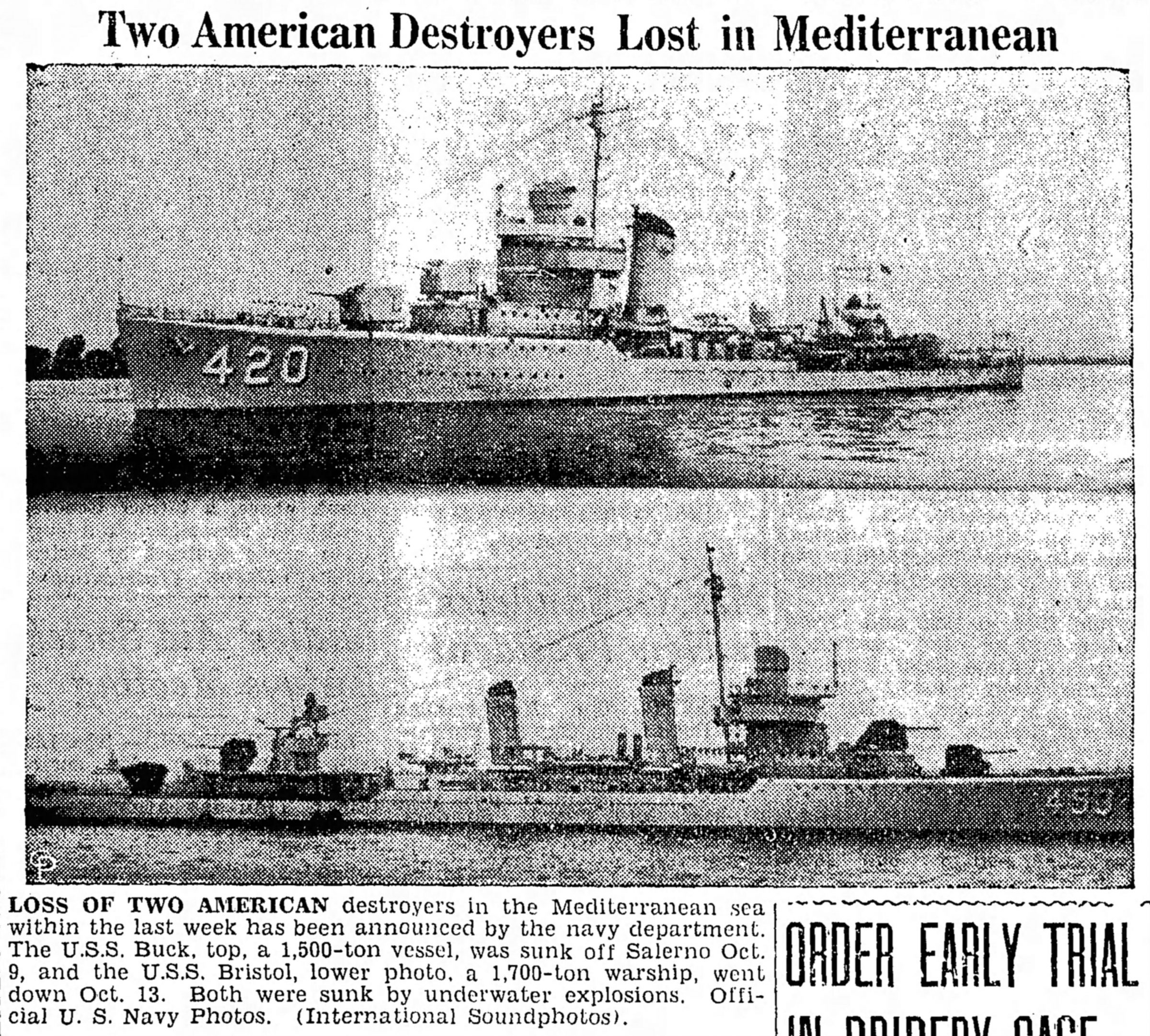At 00.36 hours on 9 Oct, 1943, the USS Buck (LtCmdr M. Klein, lost) was on patrol off Salerno, when she was hit in the bow by a Gnat, causing the forward magazine to explode and sank within four minutes.