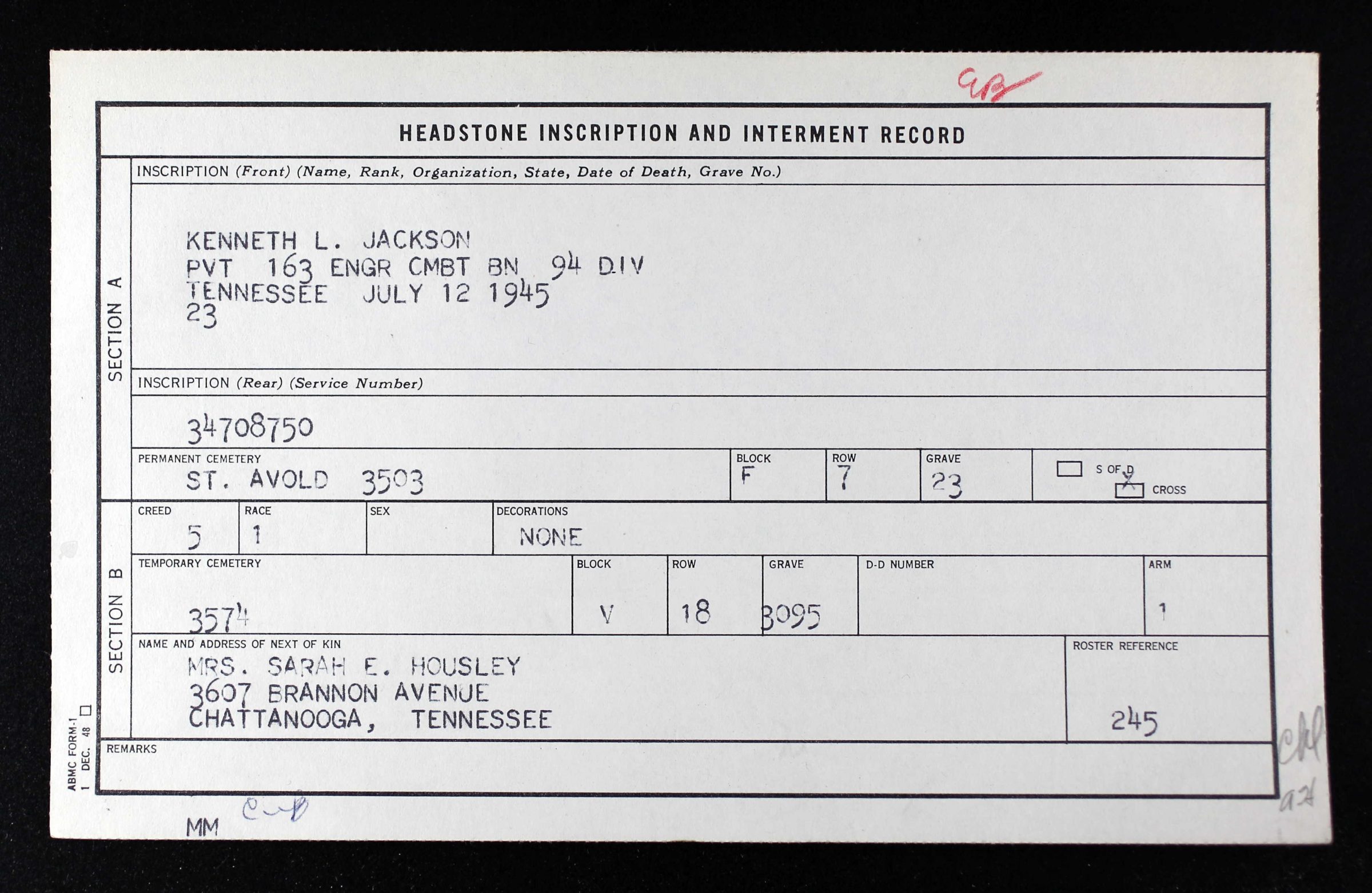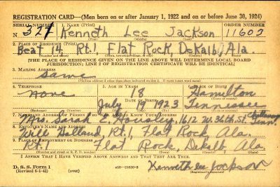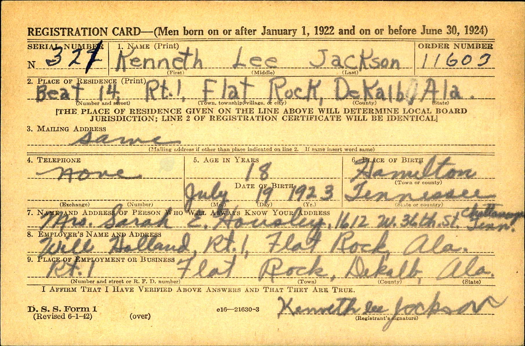 Kenneth Lee Jackson was born in Hamilton, Tennessee, the son of Thomas H. Jackson and Sarah Sue Housley.