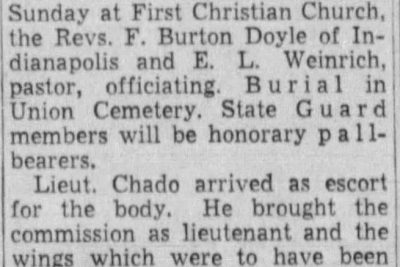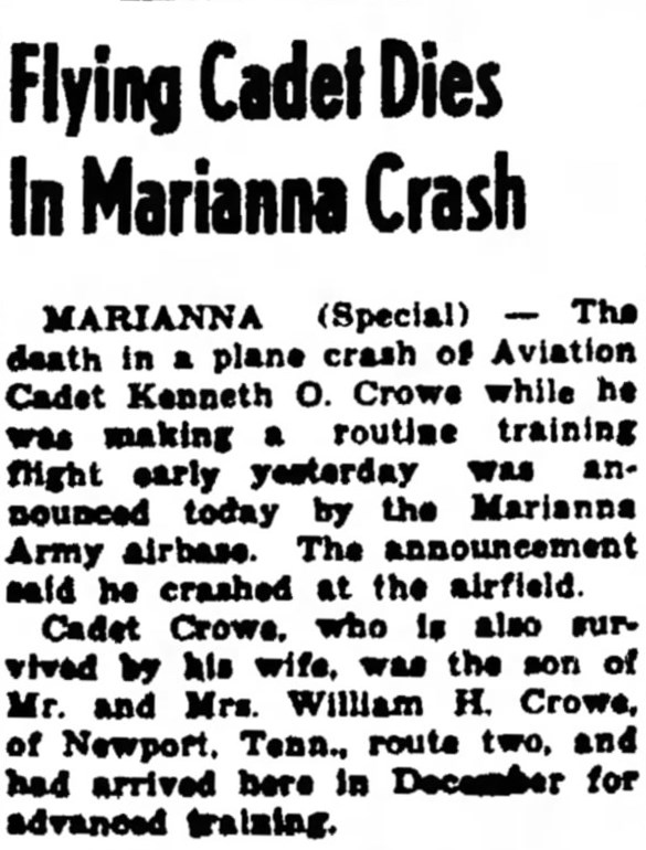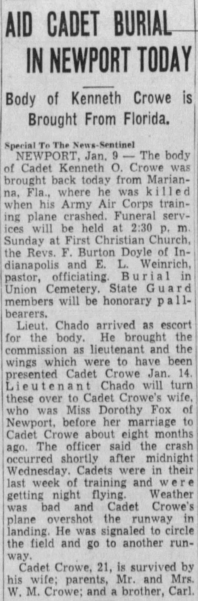 The body of Cadet Kenneth O. Crowe was brought back today from Marianna, Fla., where he was killed when his Army Air Corps training plane crashed. Funeral service will be held at First Christian Church. Burial in Union Cemetery. Lieut. Chado arrived as escort for the body. He brought the commission as lieutenant and the wings which were to have been presented Cadet Crow Jan. 14. Lieutenant Chado will turn these over to Cadet Crowe’s wife, who was Miss Dorothy Fox of Newport, before her marriage to Cadet Crowe about eight months ago. The officer said the crash occurred shortly after midnight Wednesday. Cadets were in their last week of training and were getting night flying. Weather was bad and Cadet Crowe’s plane overshot the runway in landing. He was signaled to circle the field and go to another runway.