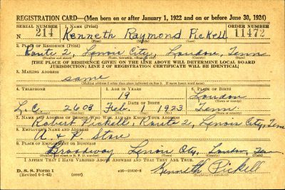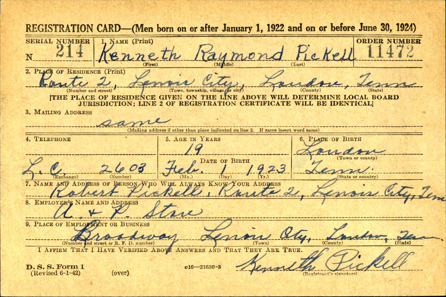 Raymond Kenneth Pickell was born on 2 February 1923 in Loudon County, Tennessee. He was the son of Robert Rutherford Pickel and Bertie Belle Maness.