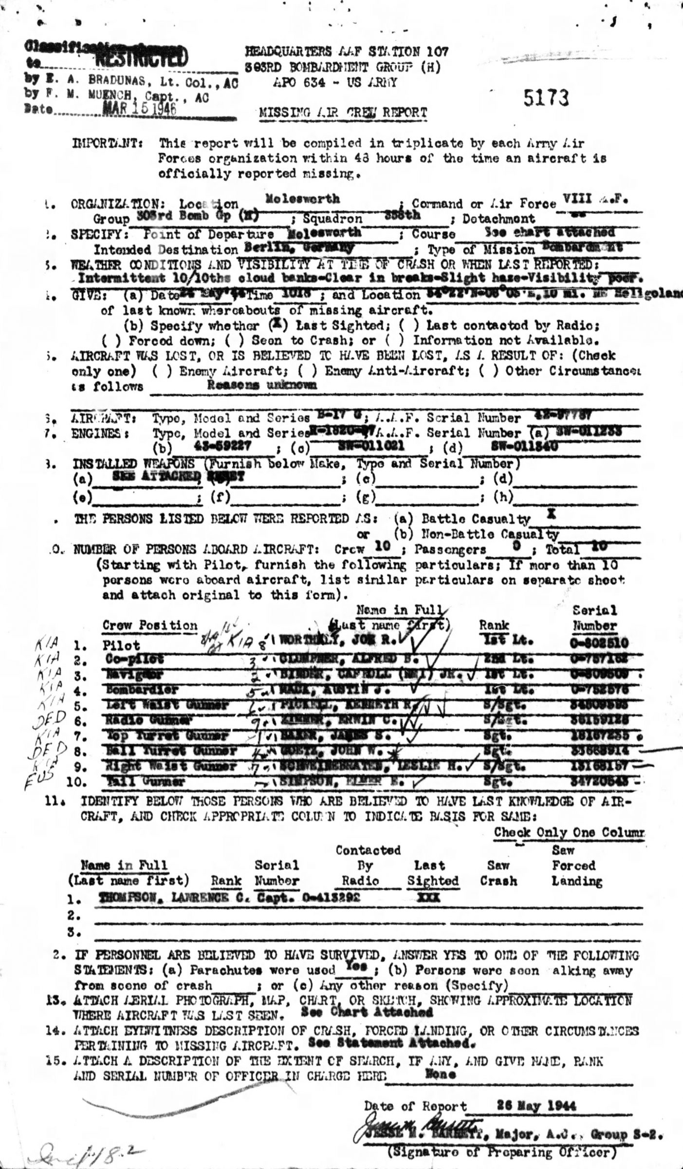 - Division/Assignment: 358th Bomber Squadron, 303rd Bomber Group, Heavy