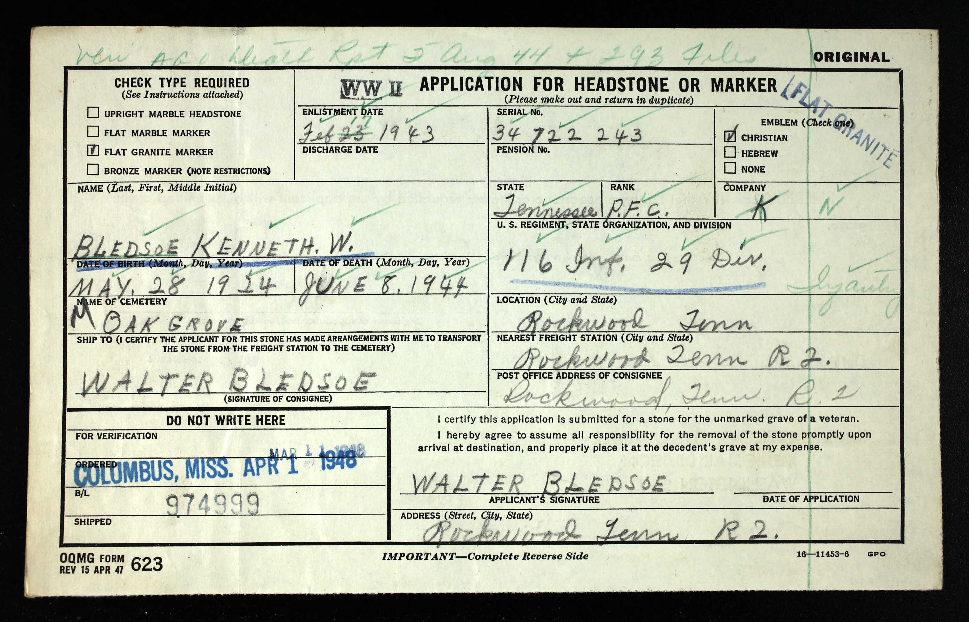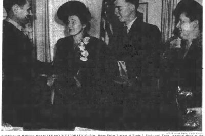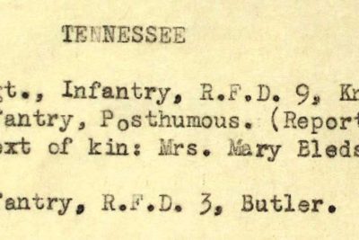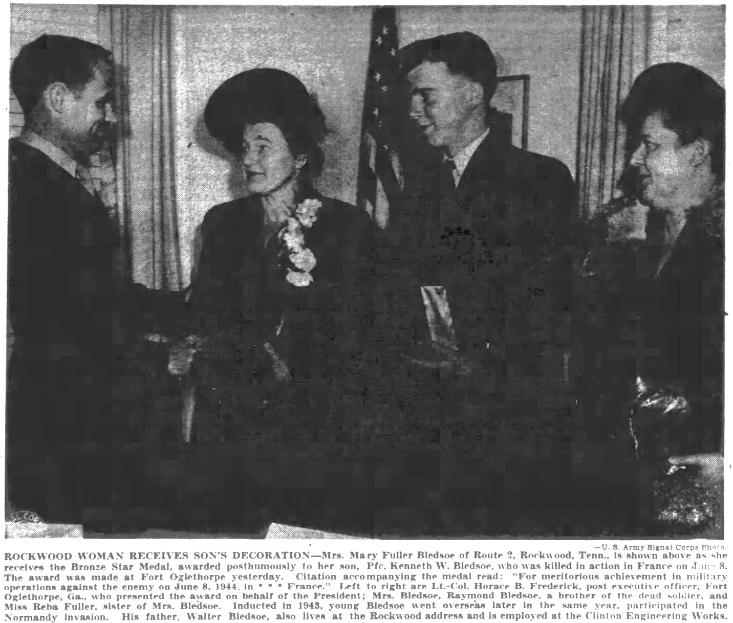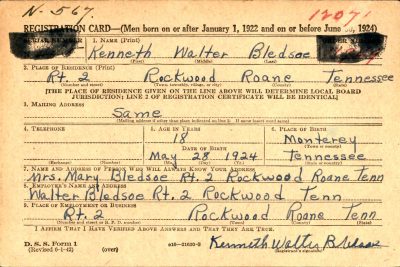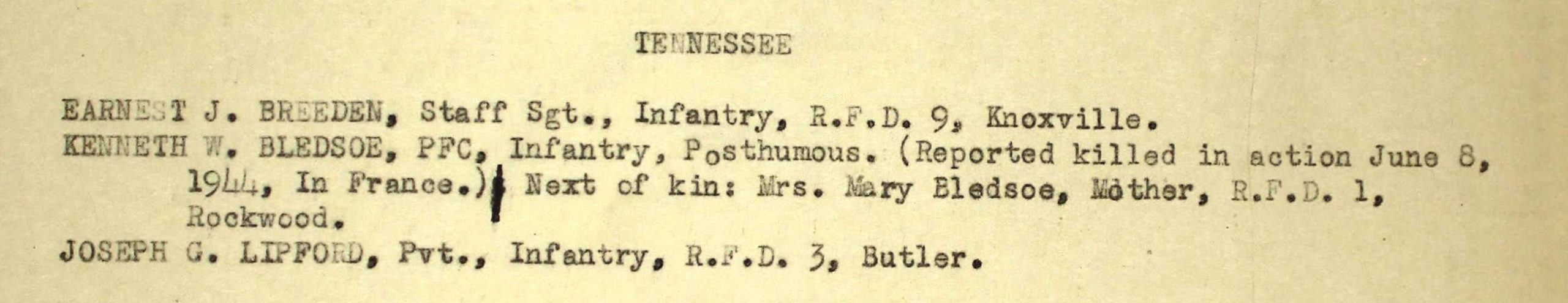 Mr. and Mrs. Walter Bledsoe of Post Oak received notification of the death of their son. Kenneth W. Bledsoe, occurring during the invasion of France. Last week word was received of his missing in action, but later the report of his death was made. Kenneth volunteered for service on Feb. 24, 1943, and received his basic training at Camp Wheeler, GA. He was later sent to England where he remained for several months prior to the invasion. PFC Bledsoe was 20 years of age.