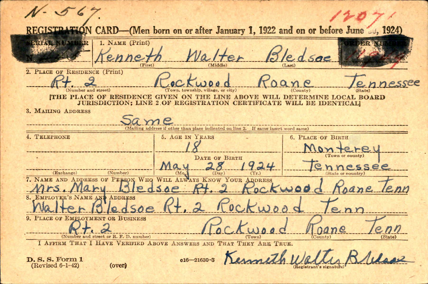 He was born 28 May 1924 in Monterey, Tennessee, the son of Walter Murray Bledsow and Mary Ogle. Brother of Raymond Stanley Bledsoe.