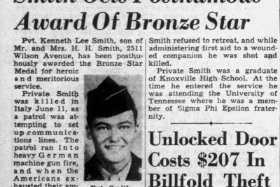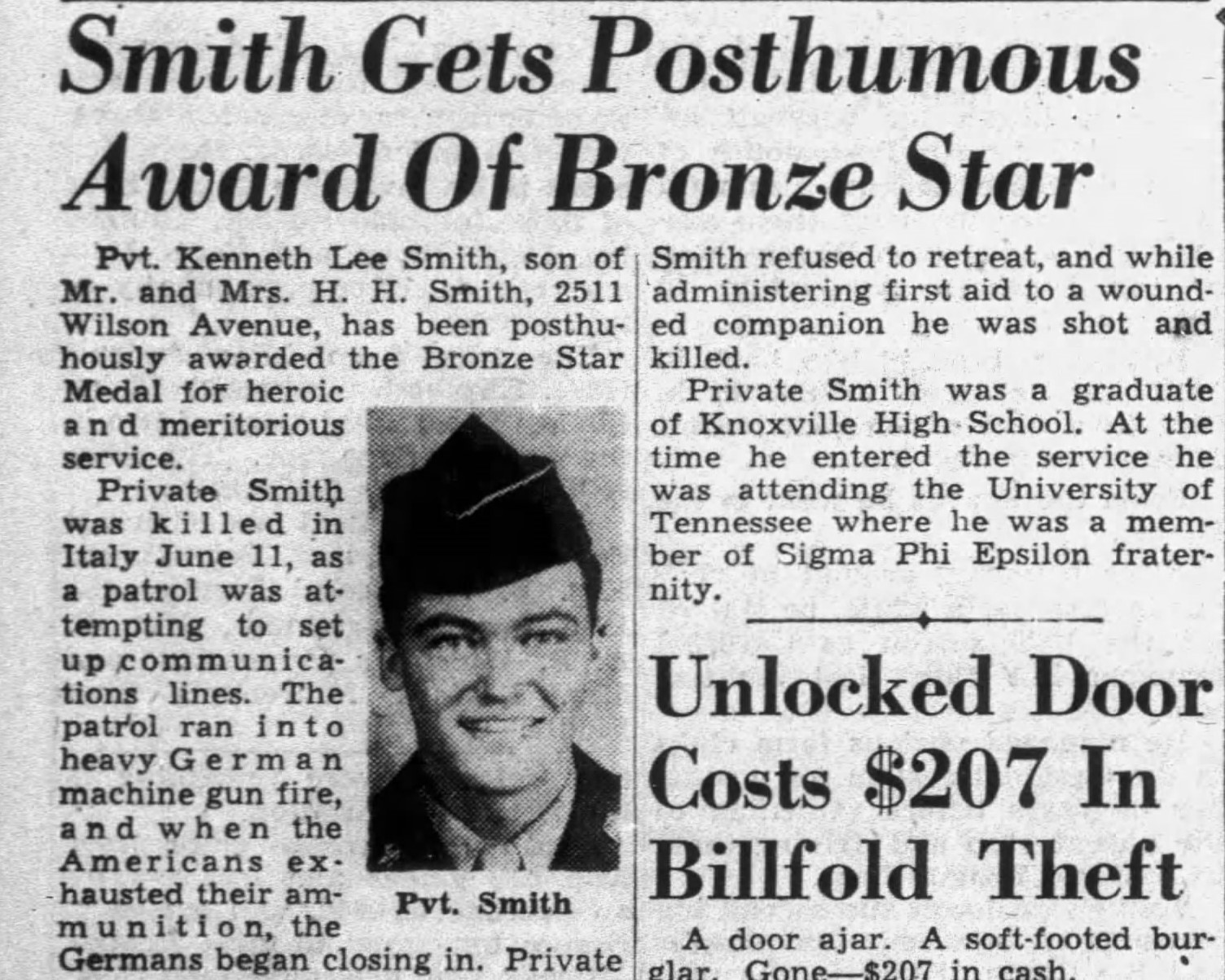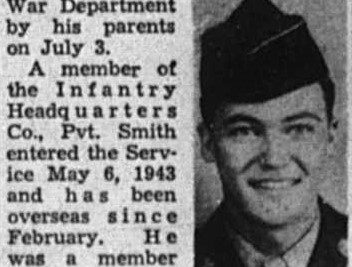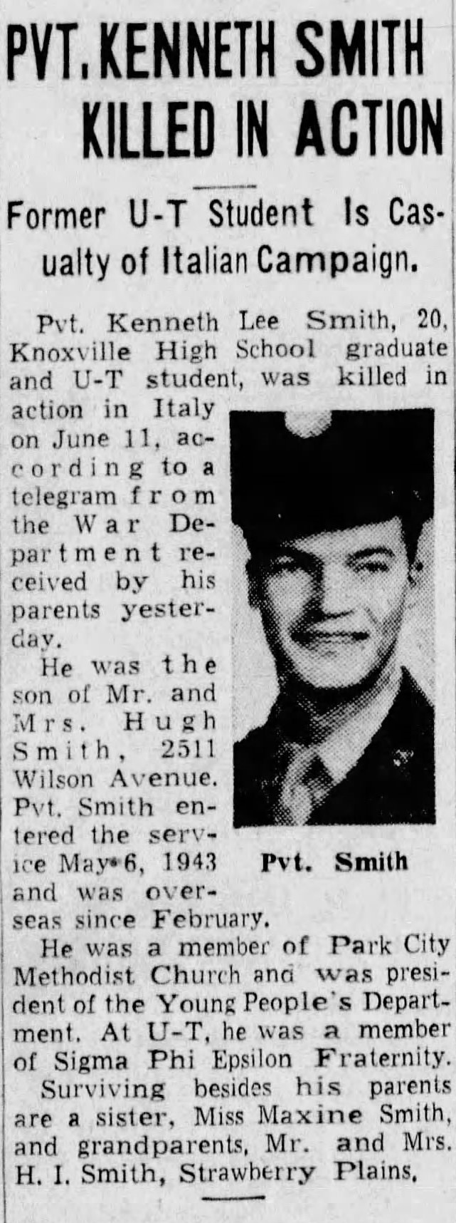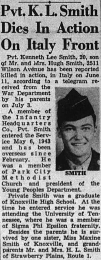 A member of the Infantry Headquarters Co., Pvt. Smith entered the service May 6, 1943 and has been overseas since February. He was a member of Park City Methodist Church and president of the Young Peoples Department. Private Smith was a graduate of Knoxville High School. At the time he entered service he was attending the University of Tennessee, where he was a member of Sigma Phi Epsilon fraternity. Besides the parents he is survived by one sister, Miss Maxine Smith of Knoxville, and grandparents Mr. and Mrs. H.L. Smith of Strawberry Plains, Route 1.