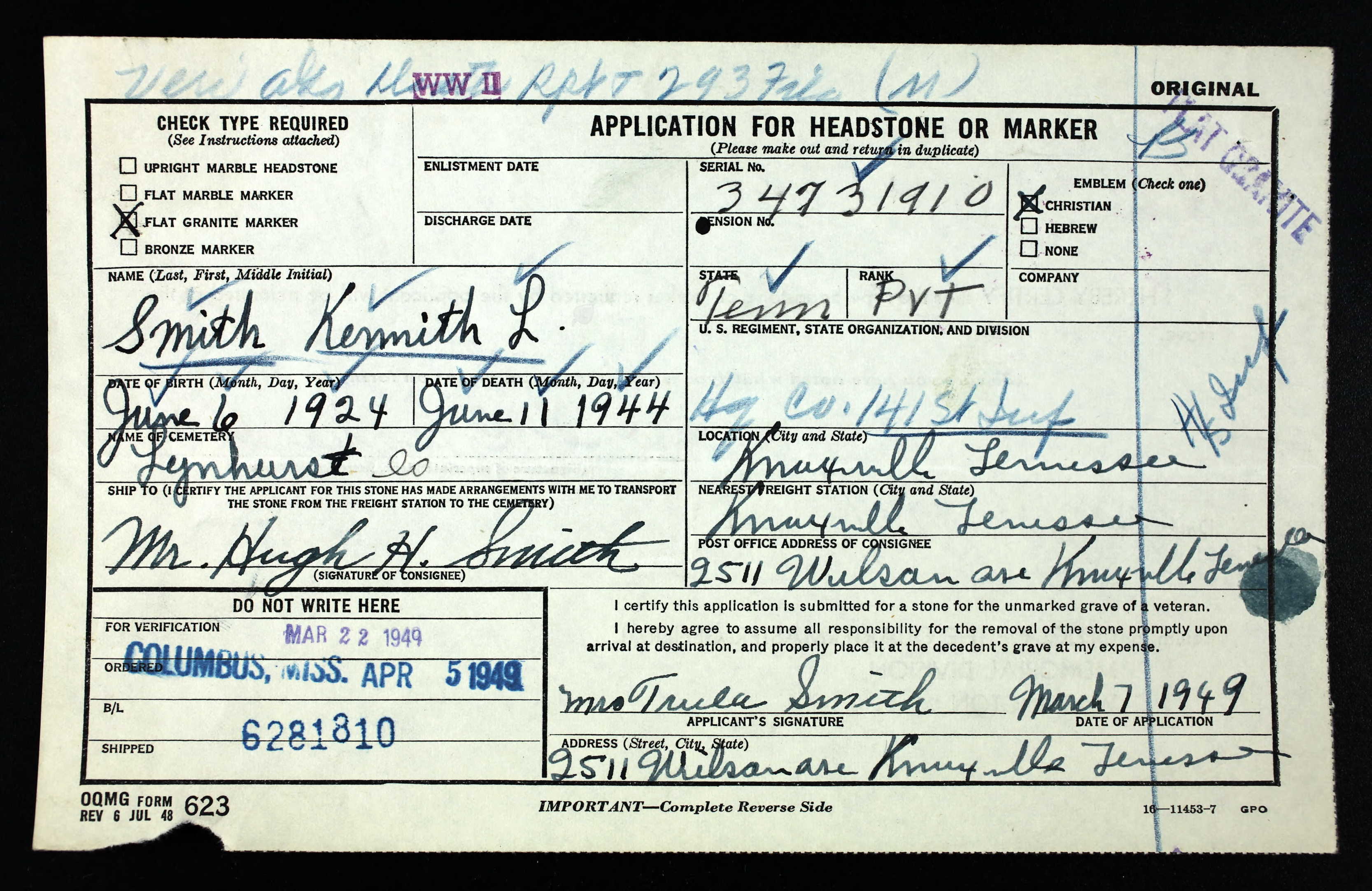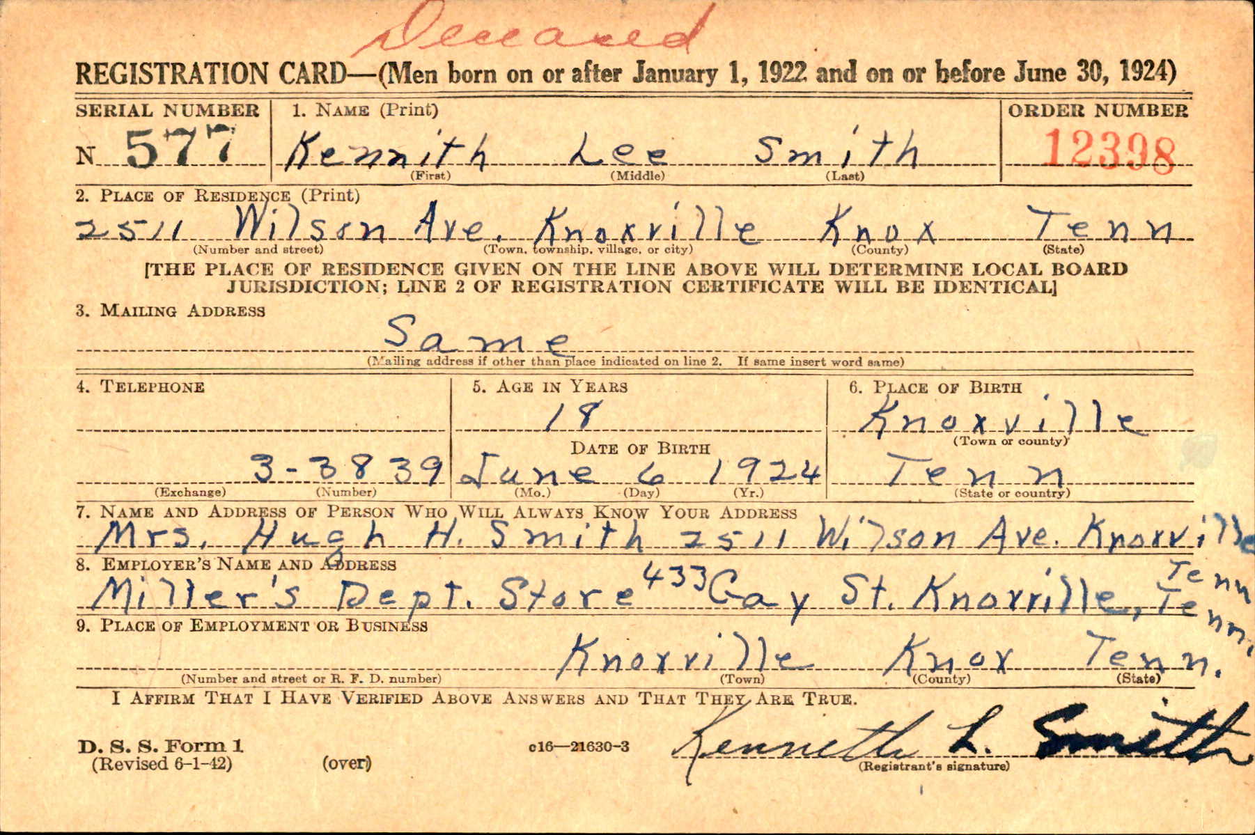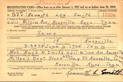 Kennith Lee Smith was born June 6, 1924 to Hugh Hayes Smith and Trula Beatrice Hodges. He was a graduate of Knoxville High school and attended U-T. He enlisted September 9, 1942, in Fort Oglethorpe, GA.
