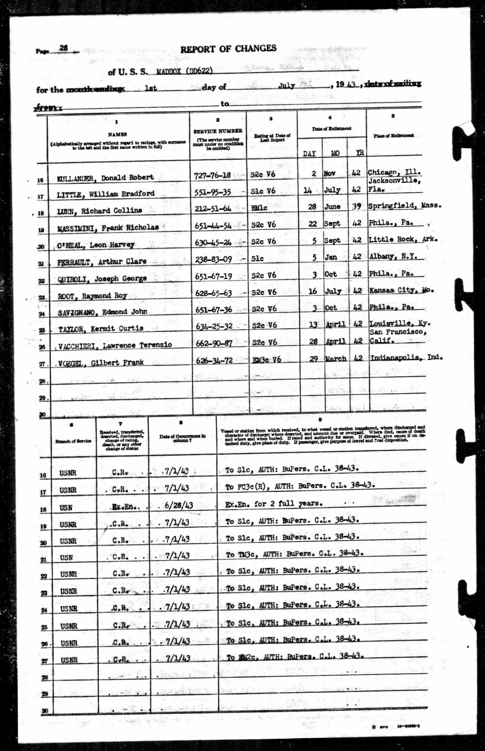 Almost immediately after this report from the Soundman on the Maddox that he had heard propeller noises, those men whose job it was to be topside simultaneously heard the roar of an airplane pulling out of a dive, the whistle of bombs, and they saw a bomb explode about 25 yards from the stern of the ship. This was instantly followed by a miss almost under the starboard propeller guard and a further terrific shock of an explosion of a bomb in the ship itself. The stern of the ship was awash within a very few seconds. Fire broke out and the ship continued to settle by the stern going down within two minutes. The survivors were in the water for about an hour before they were picked up by a tug which had been three miles away and had seen the flames and heard the explosions of the bombs. The survivors were all from the forward part of the ship except for four from the after fireroom and two men from a 20mm gun platform just aft of the #2 stack. Nine officers and 65 men survived the sinking and the senior survivor was W.R. Laird, Jr., The executive officer of the Maddox, eight officers, including the Commanding Officer, and 203 enlisted men were lost in the action.