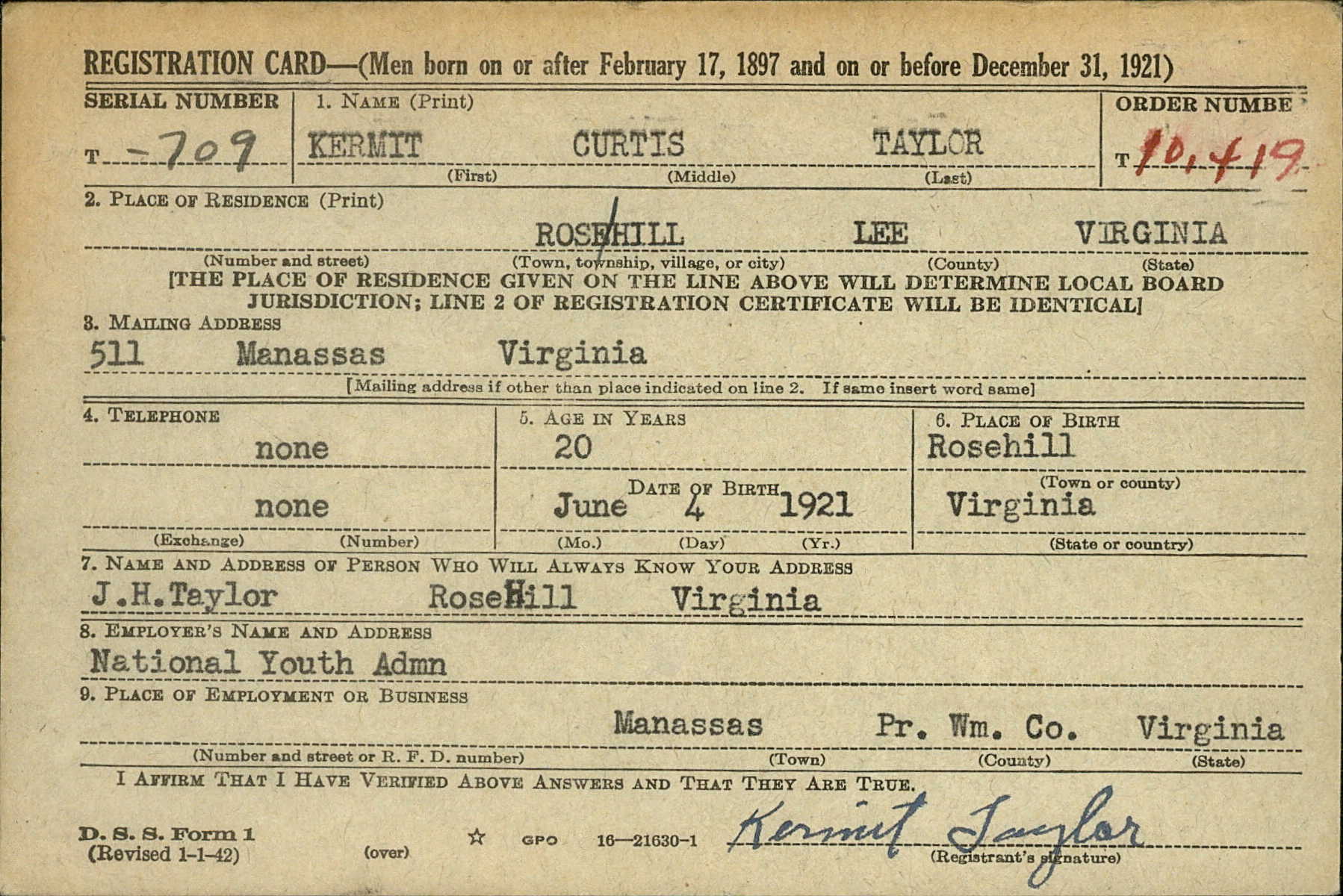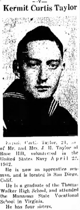Kermit Curtis Taylor was born inRose Hill, Virginia, the son of John Harmon Taylor and Elizabeth Green. He had four sisters.