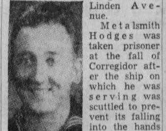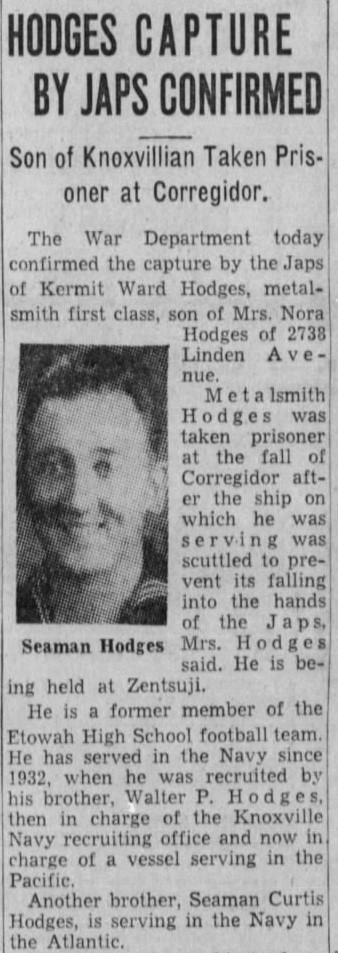 The War Department today confirmed the capture by the Japs of Kermit Ward Hodges, metalsmith first class, son of Mrs. Nora Hodges of 2738 Linden Avenue. Metalsmith Hodges was taken prisoner at the fall of Corregidor after the ship on which he was serving was scuttled to prevent its falling into the hands of the Japs, Mrs. Hodges said. He is being held at Zentsuji. He is a former member of the Etowah High School football team. He has served in the Navy since 1932, when he was recruited by his brother, Walter P. Hodges, then in charge of the Knoxville Navy recruiting office and now in charge of a vessel serving in the Pacific. Another brothers, Seaman Curtis Hodges, is serving in the Navy in the Atlantic.