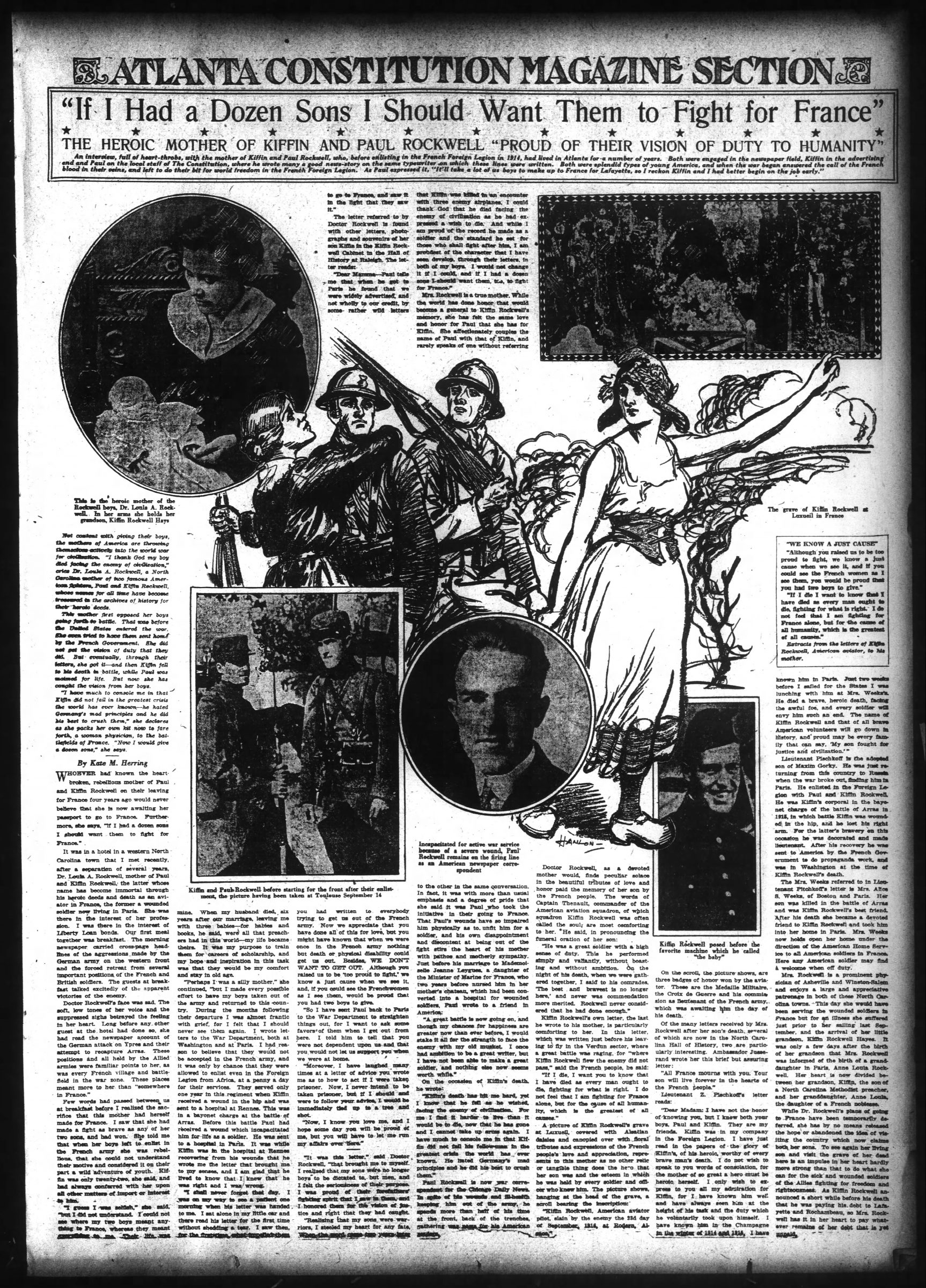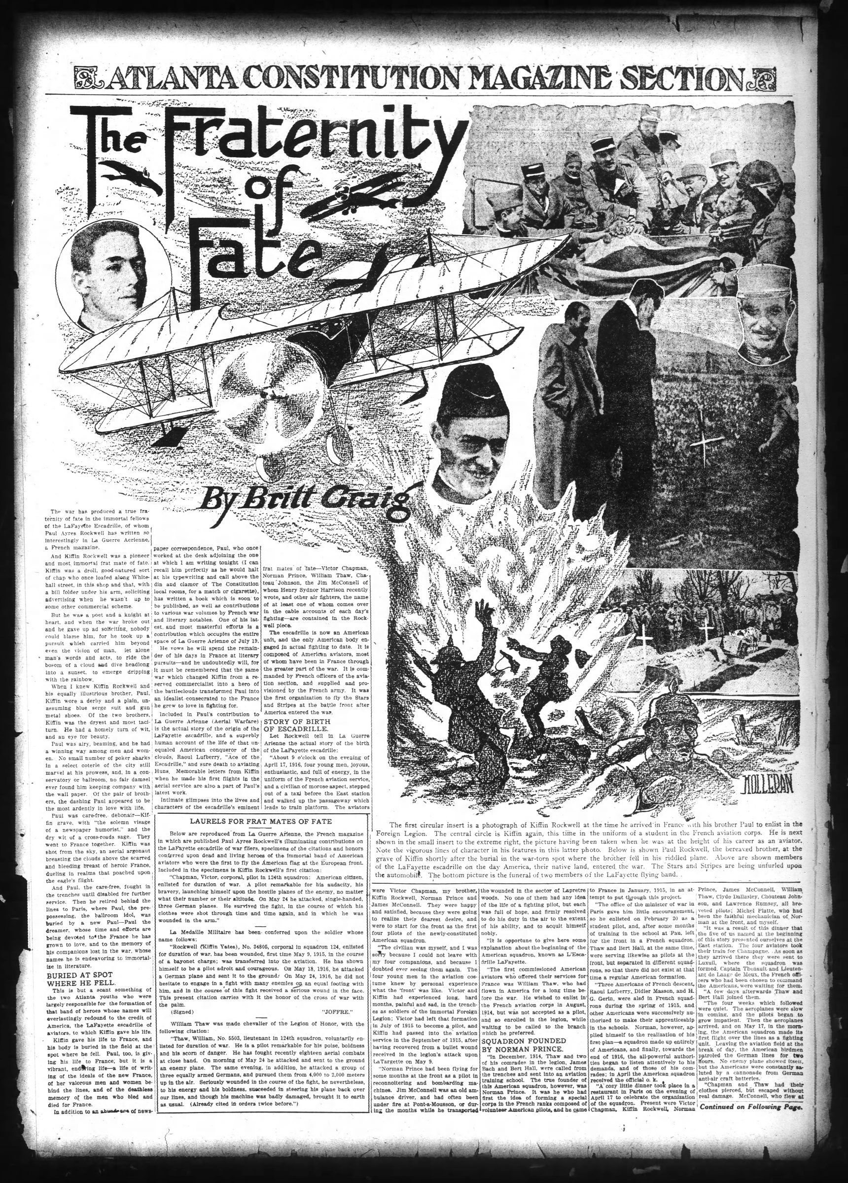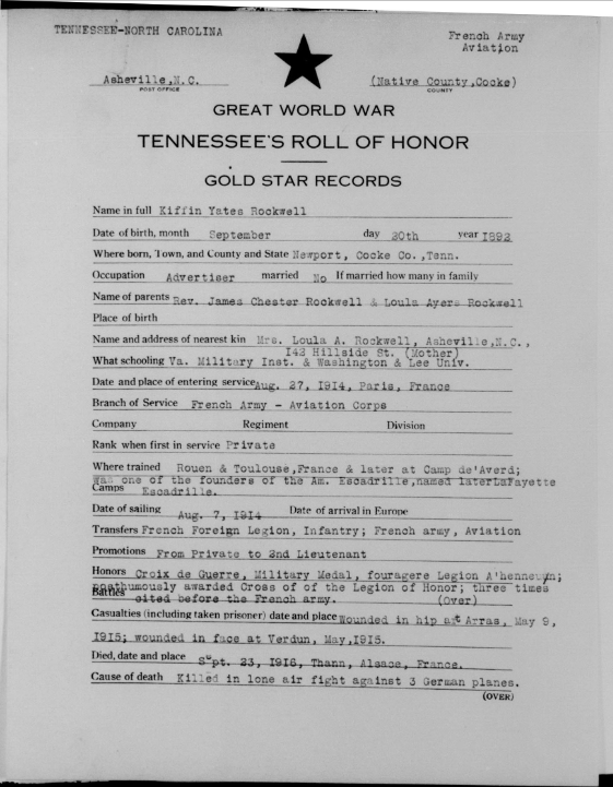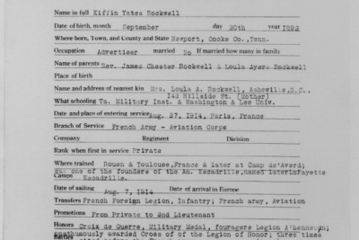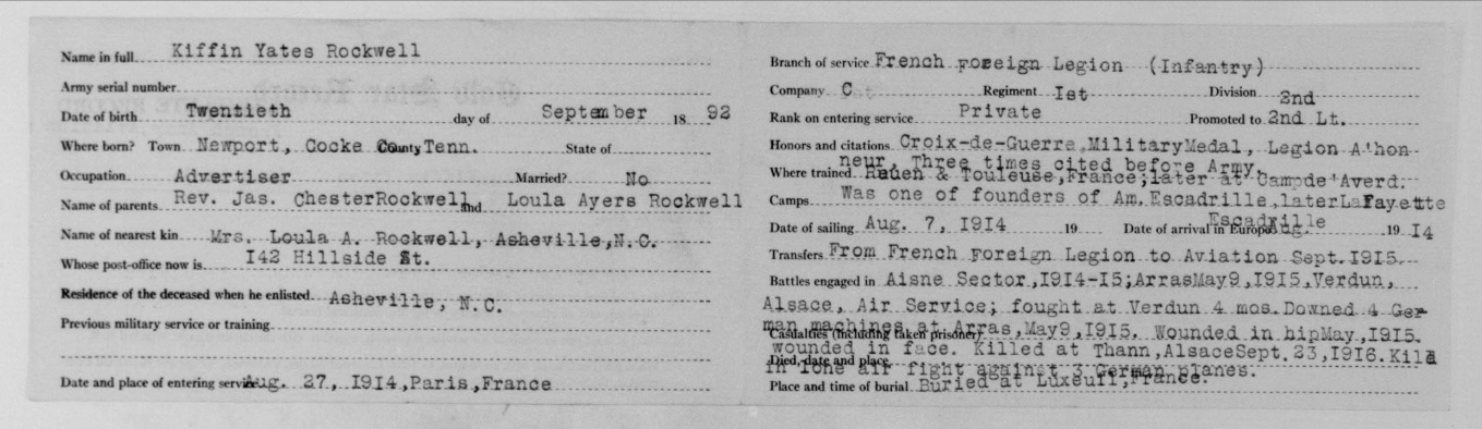 Kiffin Yates Rockwell was born in 1892 in Newport, Tennessee, the son of James Chester Rockwell and Loula Ayres. James, a Baptist minister, died shortly after Kiffin’s birth, and the family soon moved to the home of his maternal grandfather in South Carolina, and later to Asheville, North Carolina. After completing his preparatory schooling at the Orange Street School in Asheville, he enrolled at the Virginia Military Institute in 1908 and subsequently attended Washington & Lee University where his brother, Paul, was also a student. Kiffin left college in 1911 and worked for an advertising agency in Atlanta until 1914.
