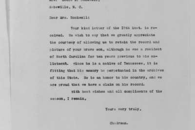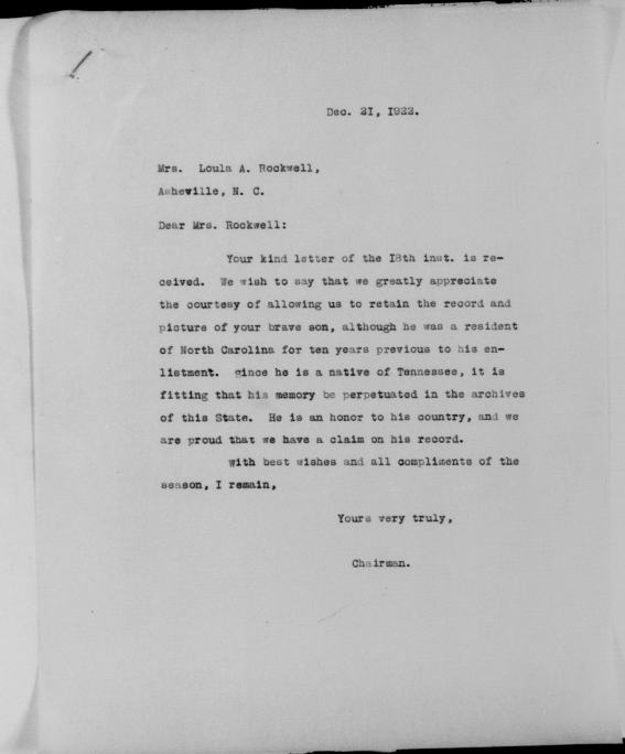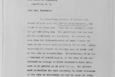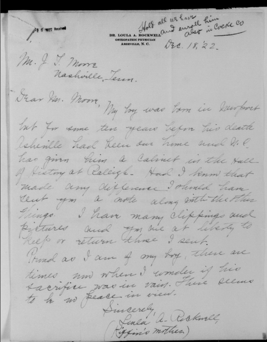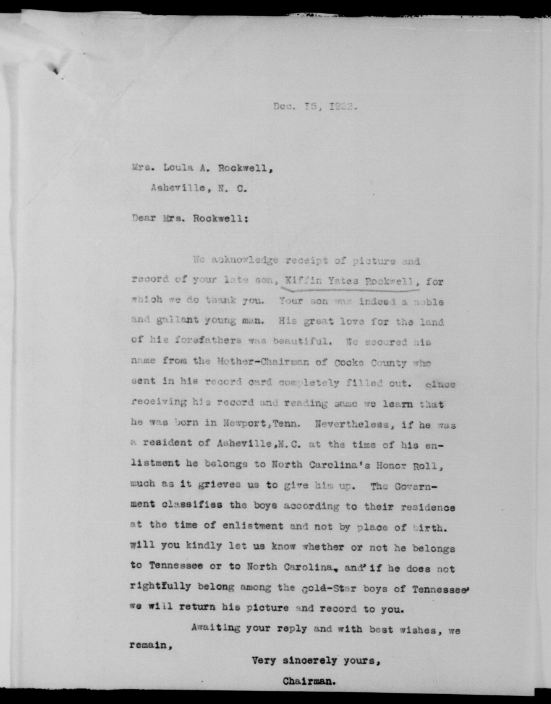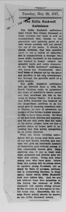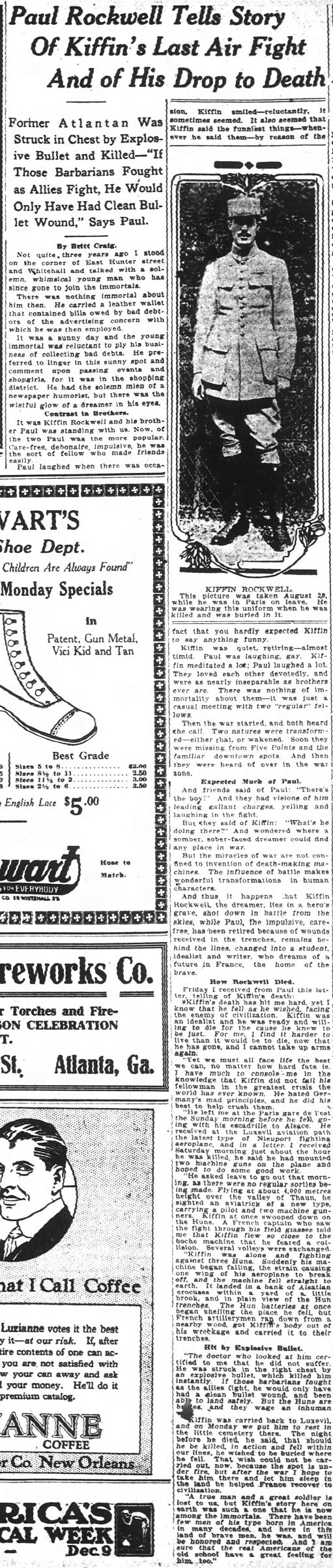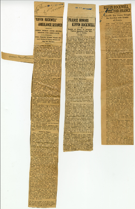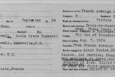 Kiffin Yates Rockwell was born in 1892 in Newport, Tennessee, the son of James Chester Rockwell and Loula Ayres. James, a Baptist minister, died shortly after Kiffin’s birth, and the family soon moved to the home of his maternal grandfather in South Carolina, and later to Asheville, North Carolina. After completing his preparatory schooling at the Orange Street School in Asheville, he enrolled at the Virginia Military Institute in 1908 and subsequently attended Washington & Lee University where his brother, Paul, was also a student. Kiffin left college in 1911 and worked for an advertising agency in Atlanta until 1914.