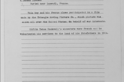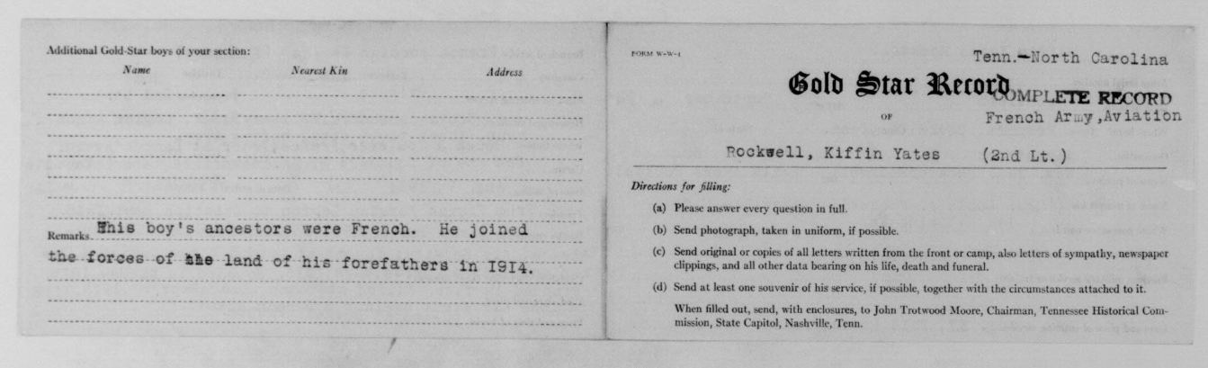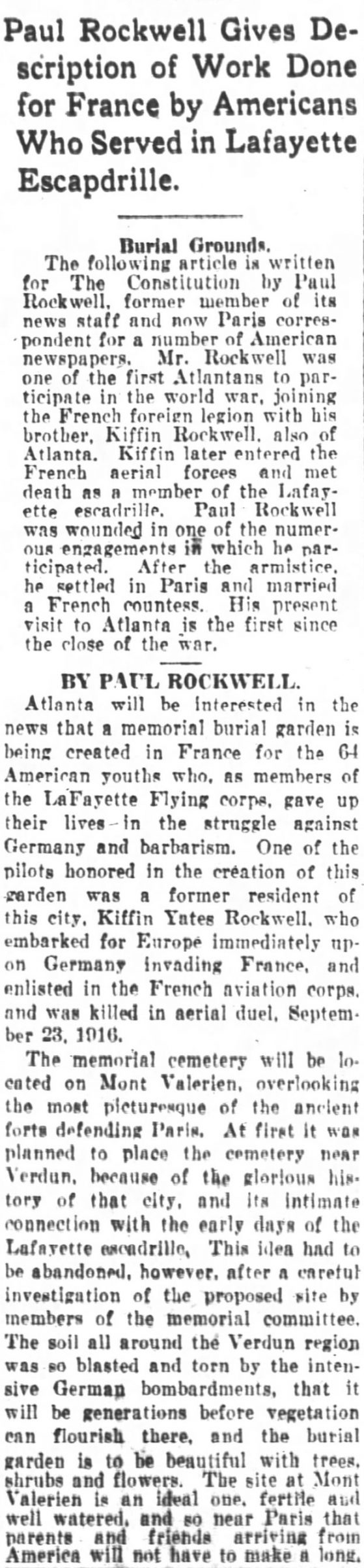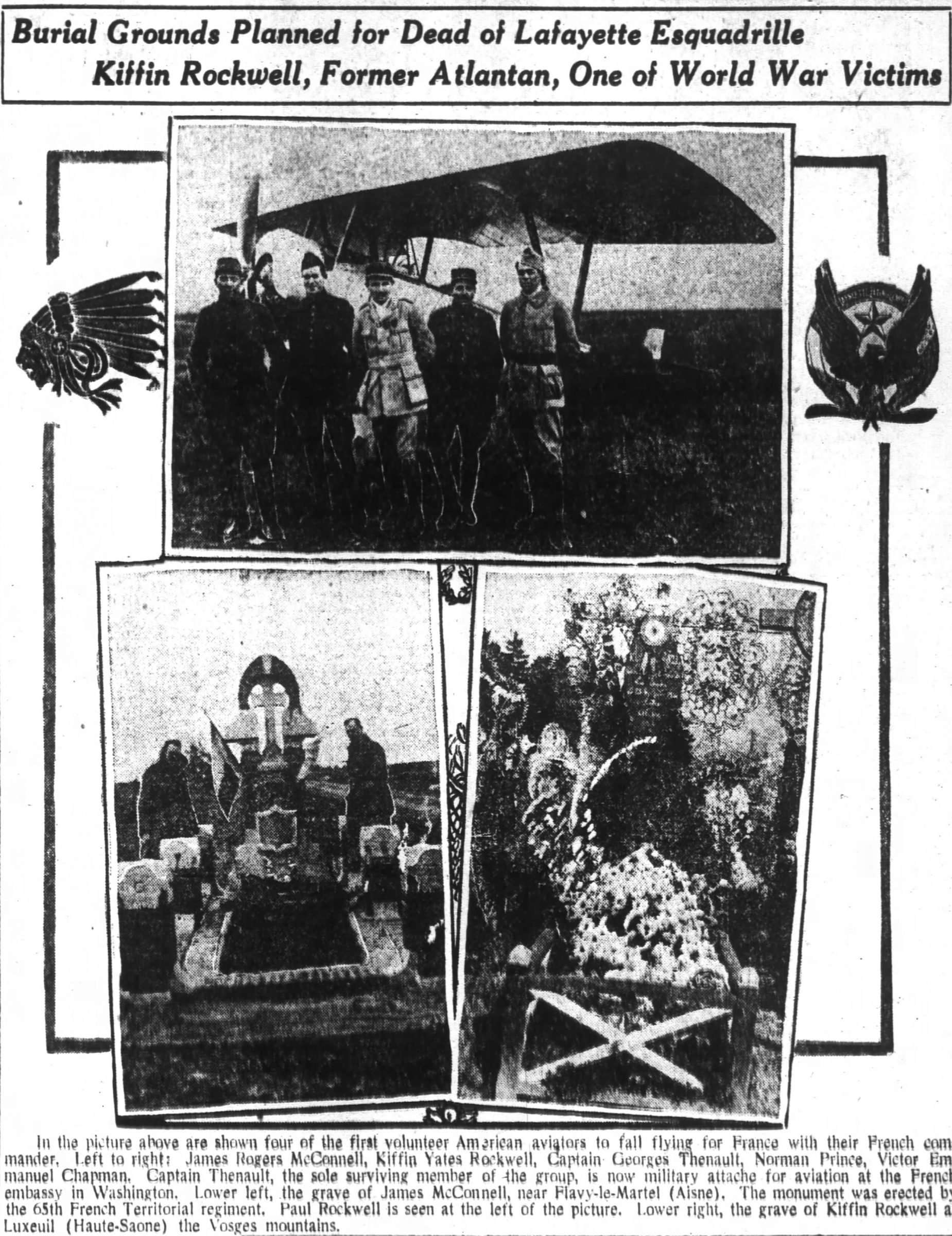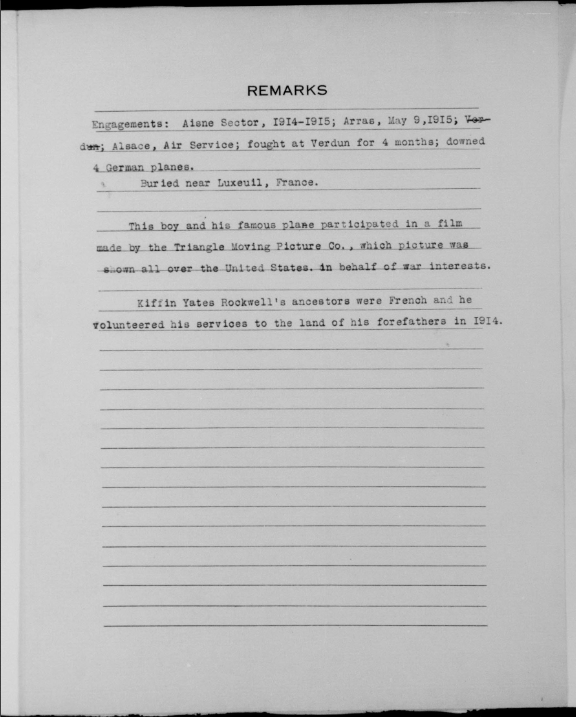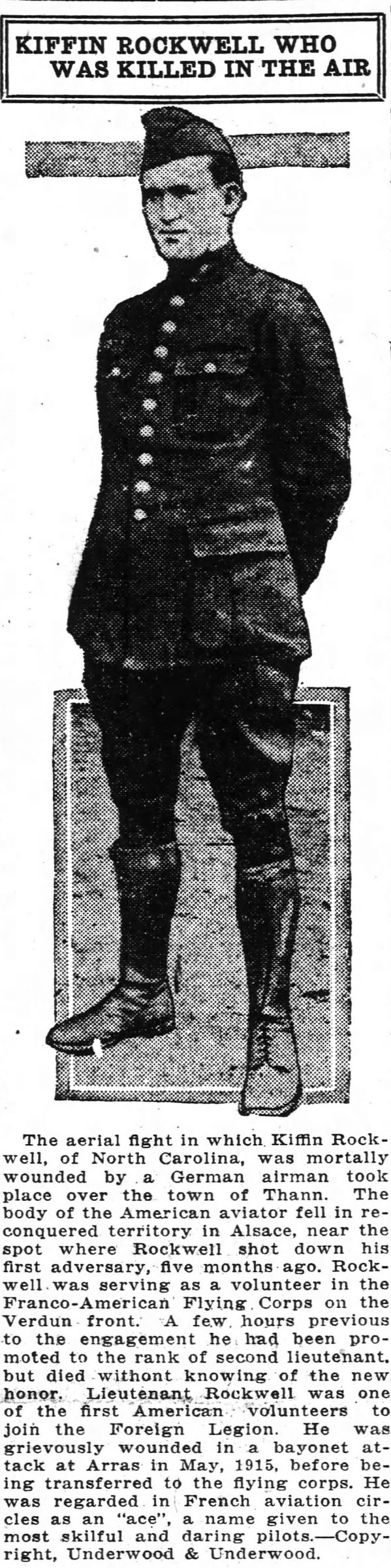 Rockwell was accepted by the Service Aéronautique, began flight training in September 1915 and in April became one of the founding pilots in the squadron initially known as the Escadrille Américaine (later called the Lafayette Escadrille). In May 1916, while on patrol at the front, he became the first American pilot to down an enemy plane. Rockwell subsequently flew dozens of patrols and fought in many air battles, gaining fame for his skill and courage. His final combat took place on September 23, 1916, when his Nieuport was downed by the gunner in a German Albatross observation plane. Rockwell is buried in the cemetery at Luxeuil-les-Bains, France. His name is inscribed on the walls of the Panthéon in Paris, where is remembered for his sacrifices for the French Republic.