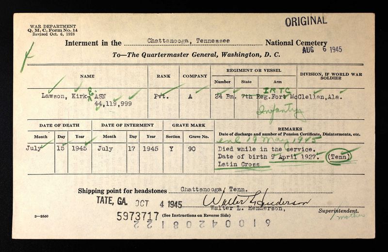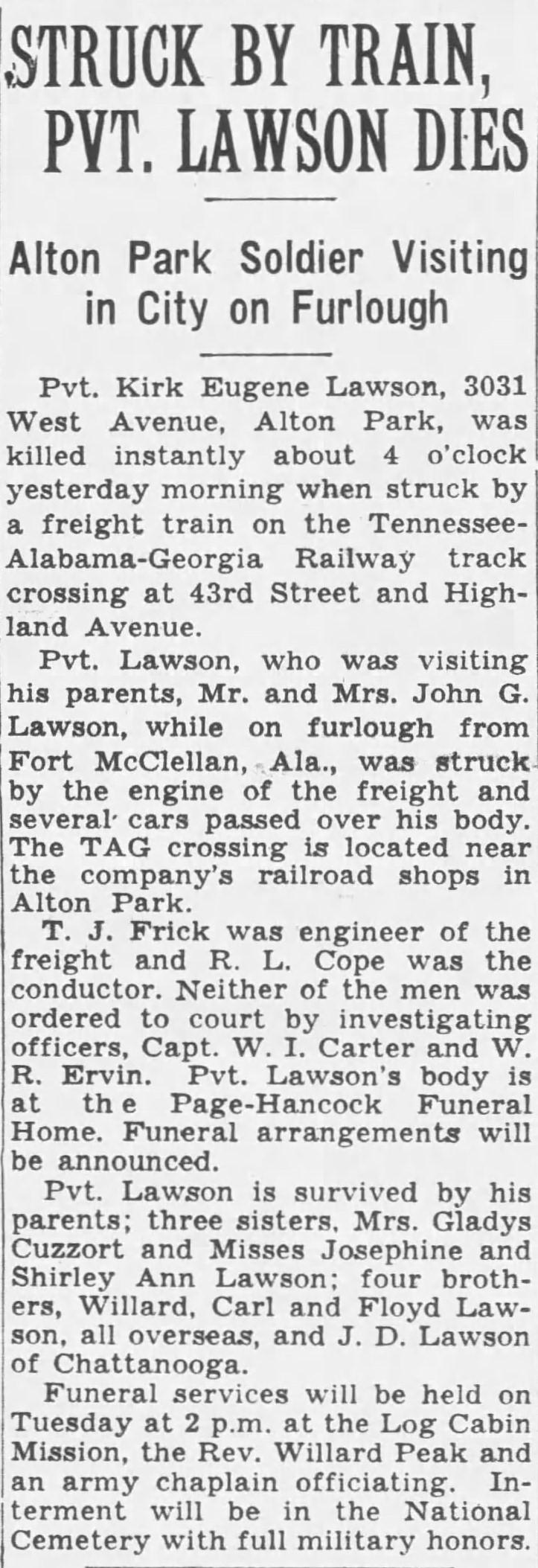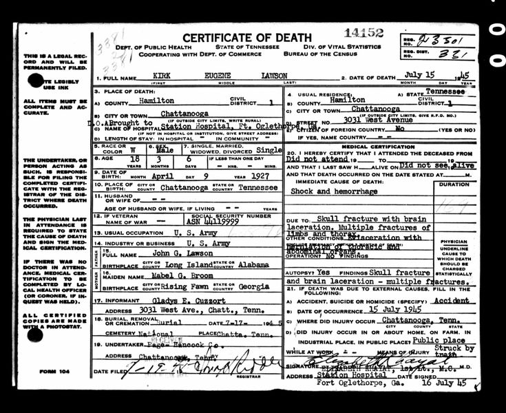 Pvt Lawson died at the Station Hospital, Fort Oglethorpe, Georgia. He was struck by a train at Chattanooga, Tennessee.