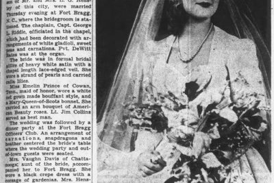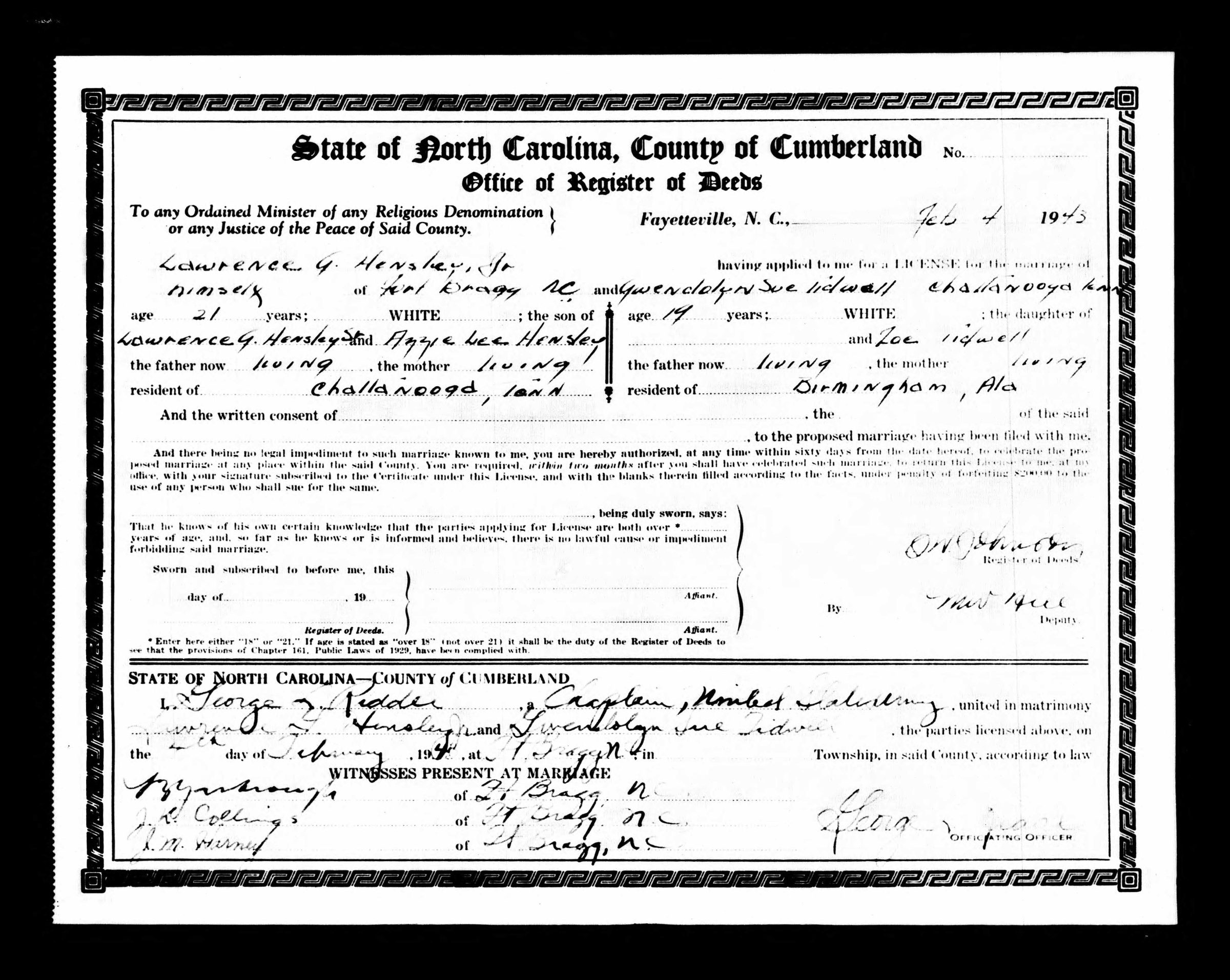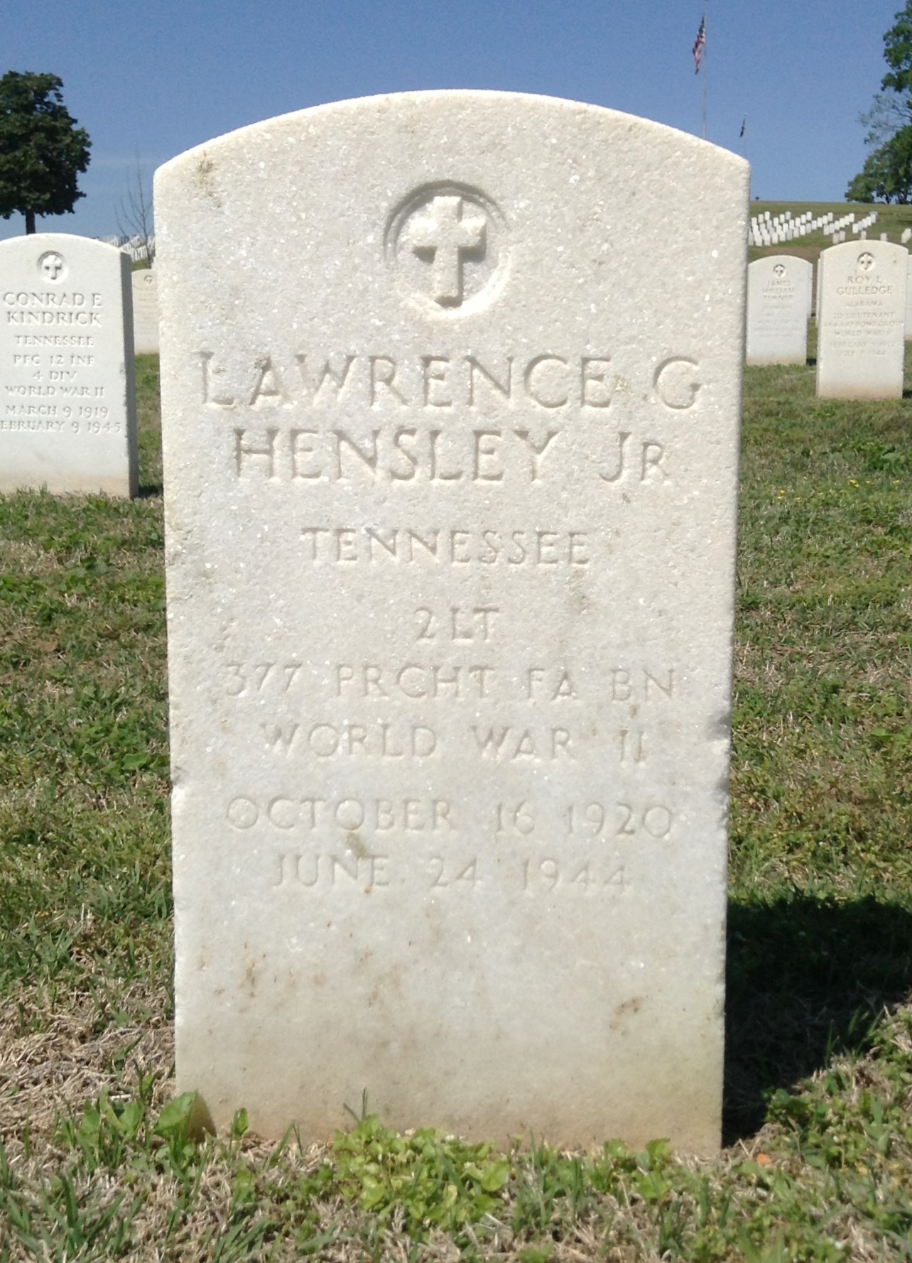 Lawrence Grady Hensley Jr. was born on 16 October 1920, the son of Lawrence Grady Hensley Sr. and Aggie Lee Hensley. He married Gwendolyn “Gwyn” Sue Tidwell in North Carolina on 4 February 1943. 2nd Lt Hensley died of wounds in Normandy. He was returned from Ste-Mère-Eglise No. 1, Carentan, France. Buried at Chattanooga National Cemetery, Y, 438.