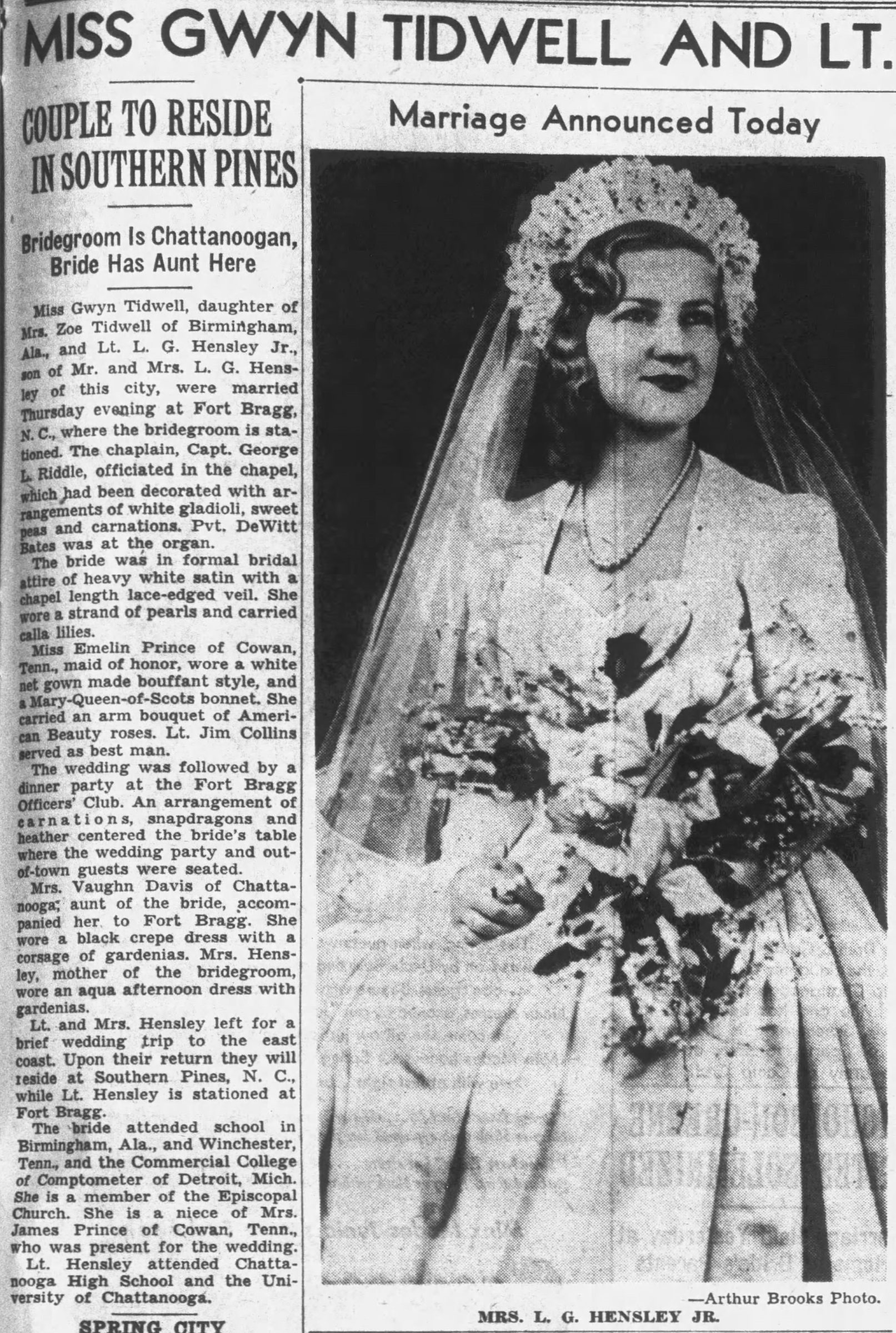 Lt. Hensley was the son of Mr. and Mrs. L.G. Hensley Sr. of Hickory Street, Chattanooga. He had attended the University of Chattanooga before enlisting. Mrs. Hensley Jr., formerly Miss Gwyn Tidwell of Tracy City, Tenn., has been residing with her aunt, Mrs. Von Davis, Winchester. The young widow has a brother, F1C Travis Tidwell, who is with the U.S. Navy in the South Pacific.