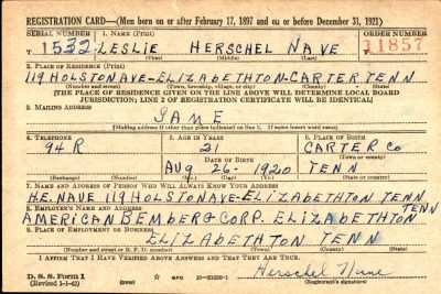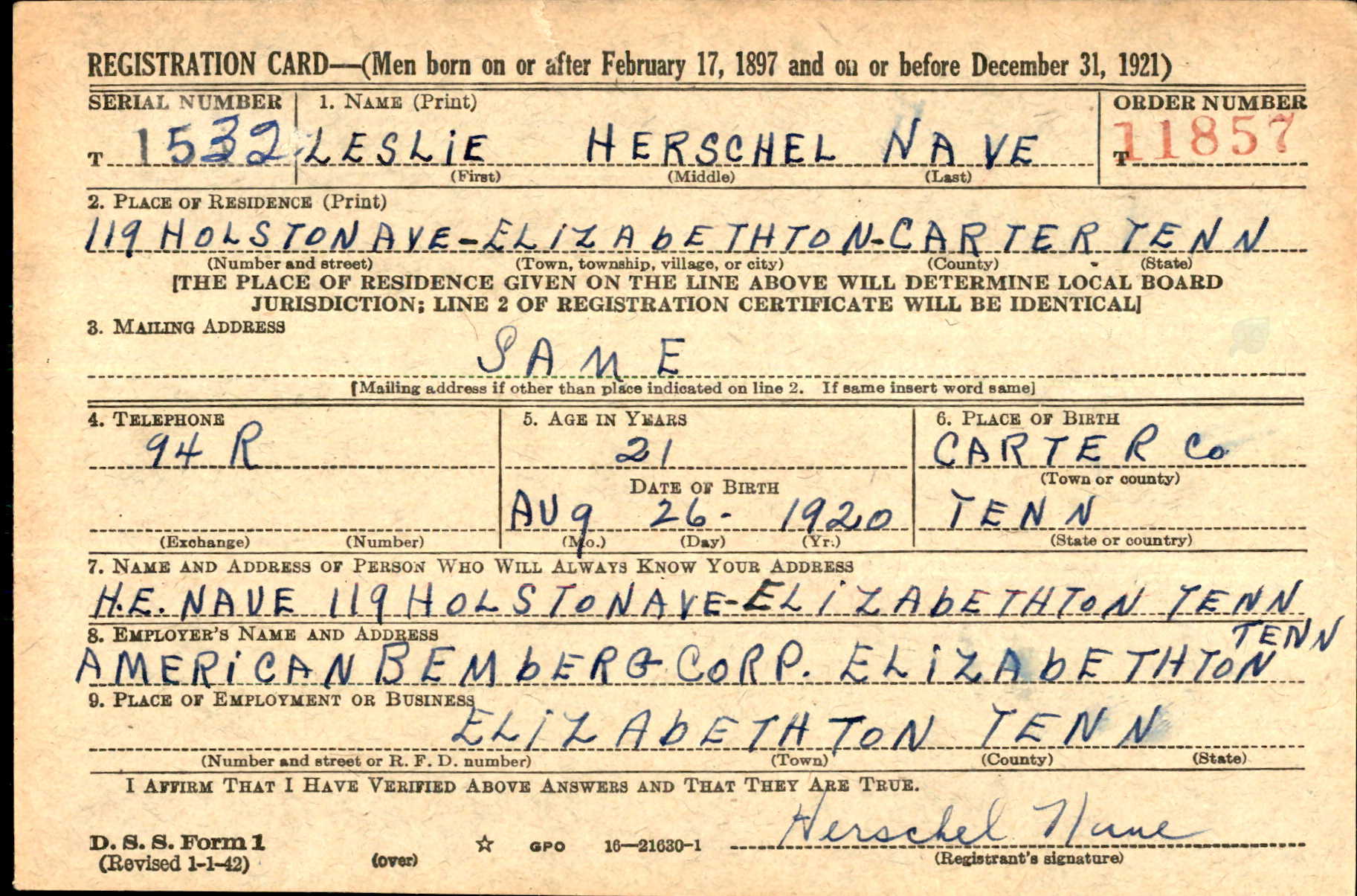 Leslie Herschel Nave was born on 26 August 1920, the son of Henry Eugene Nave and Hettie Mae Gouge. His brother Harry K. Nave, Aviation Cadet, 21 years old, died 1943 in a plane crash at the Roswell Army Flying School.